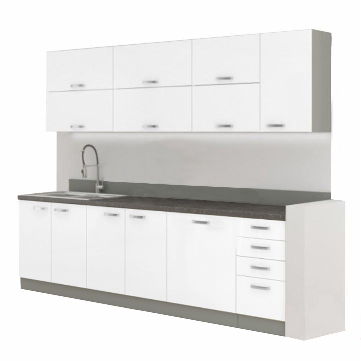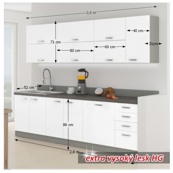 Kuchyňská linka PRADO Materiál: Barva: bílá extra vysoký lesk, korpus: šedý Šířka horní a spodní sestavy: 2,6 m Spodní skříňky (VxH): 86x52 cm Horní skříňky (ŠxHxV): 80/60/40x31x71 cm Včetně pracovní desky, rozměr 2,6 m Systém tichého dorazu zásuvek Systém tichého zavírání dvířek Bez dřezu Tloušťka pracovní desky metalic brown: 28 mm Dodáváno bez dekorací a spotřebičů Dodáváno v demontu tloušťka pracovní desky 28 mm, horní i dolní rozměr 2,6 m, dolní skříňky ZZ jsou dodávány včetně pracovní desky a dolní lišty, dřezová skříňka bez pracovní desky. Sektorové skrinky sú dodávané bez pracovnej dosky vrátane spodnej lišty. Možnost dokoupit PD metalic brown v ceně 1.690 Kč/1m. K našim kuchyňským skříňkám si můžete objednat i dřezy, baterie a příslušenství.