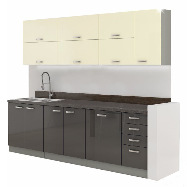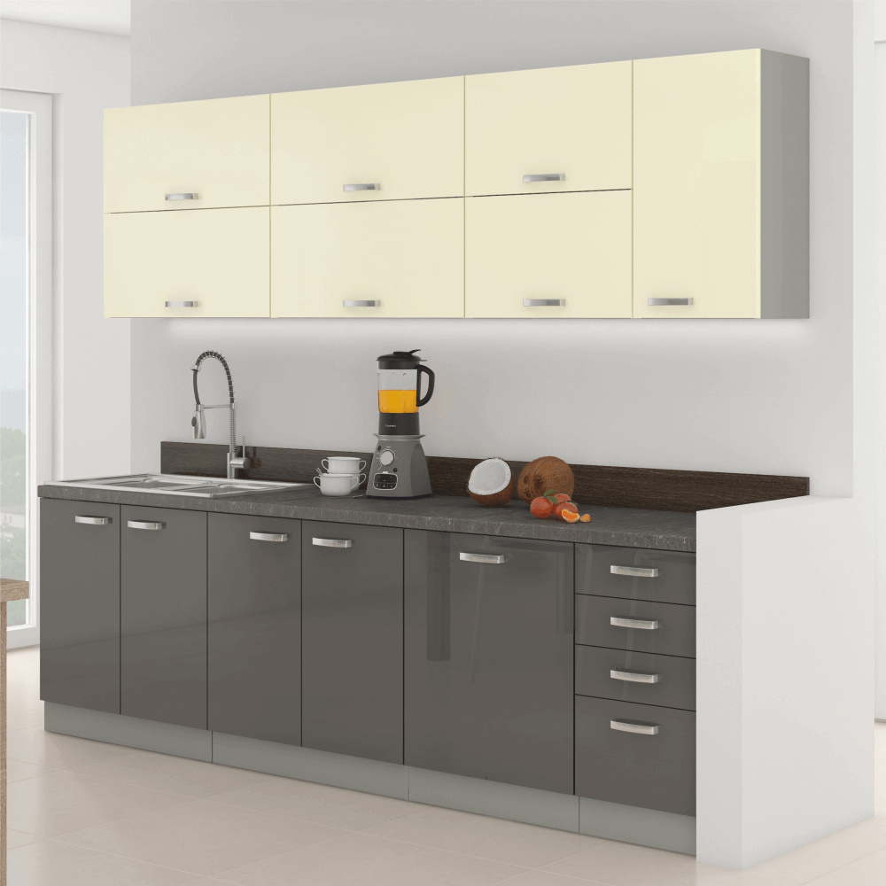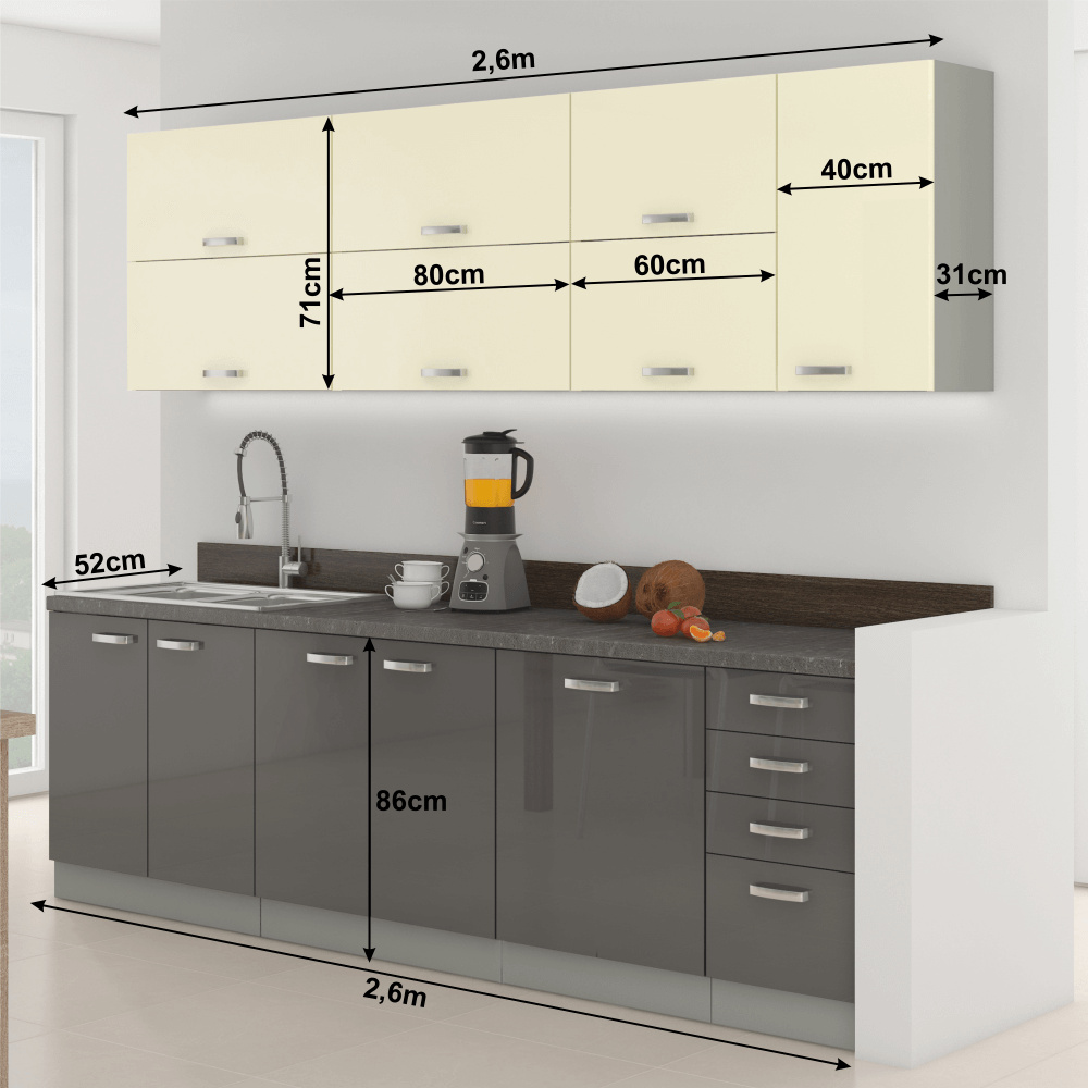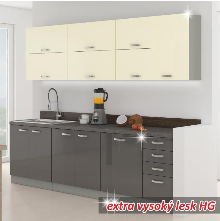 Kuchyňská linka PRADO Materiál: Barva: krémová/šedá - extra vysoký lesk, korpus: šedý Šířka horní a spodní sestavy: 2,6 m Spodní skříňky (VxH): 86x52 cm Horní skříňky (ŠxHxV): 80/60/40x31x71 cm Včetně pracovní desky, rozměr 2,6 m. Bez dřezu Systém tichého dorazu zásuvek Systém tichého zavírání dvířek Tloušťka pracovní desky: 28 mm Dodáváno bez dekorací a spotřebičů Dodáváno v demontu tloušťka pracovní desky 28 mm, horní i dolní rozměr 2,6 m, dolní skříňky ZZ jsou dodávány včetně pracovní desky a dolní lišty. K našim kuchyňským skříňkám si můžete objednat i dřezy, baterie a příslušenství.