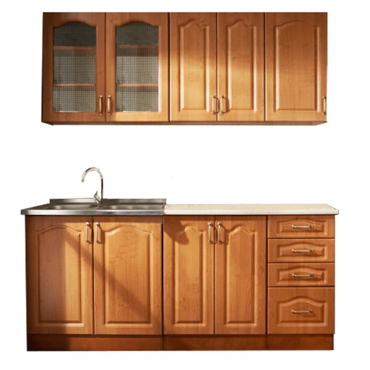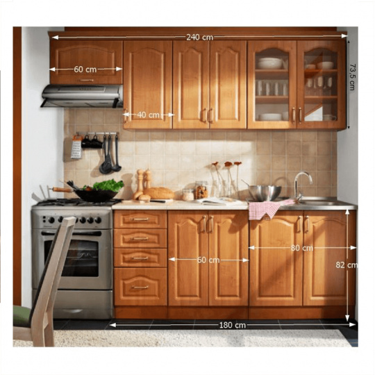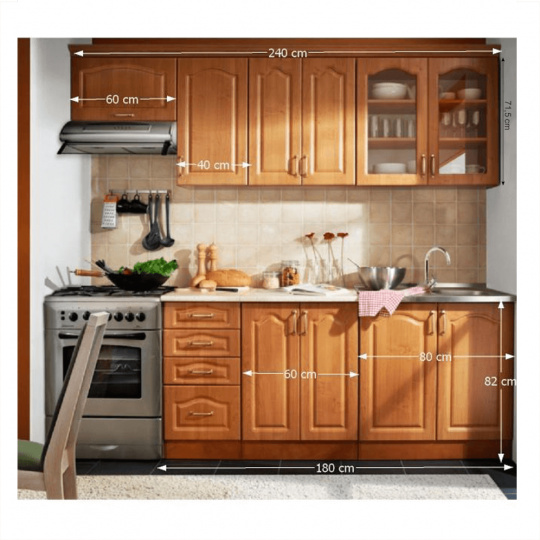 Kuchyňská sestava LORA MDF NEW KLASIK Materiálové provedení: DTD laminovaná / MDF foliovaná Barevné provedení: olše Horní část (ŠxV): 240x73,5 cm Na pravé horní straně: skleněná skříňka Nad digestoří je skříňka se šířkou 60 cm Ve střední horní části je dvoudveřová skříňka Ve střední horní části je skříňka se šířkou 40 cm Dolní část (ŠxV): 180x82 cm Tloušťka materiálu: 16 mm Na pravé dolní části: dřezová dvoudveřová skříňka Na levé dolní části: čtyři šuplíky Ve střední dolní části je dvoudveřová skříňka Dřezová skříňka dodávána bez pracovní desky a dřezu Dodávané v demontu. Dřezová skříňka dodávána bez pracovní desky. Možnost dokoupení ruzných sektorových skríněk,koruny a univerzálního L/P dřezu. Cena za 1 bm pracovní desky ke LORA MDF klasik olše je 1.450 Kč. Ceny spodních skřínek jsou bez pracovní desky. Cena za 1 bm koruny je 590 Kč a koruny na W60/60 je 590 Kč Požadovaný rozměr ozdobné lišty napište do poznámky v objednávce. Horní skříňky se nemontují na lištu, ale věší se na háčky. Háčky do zdi nejsou součástí balení, je třeba si je dokoupit.