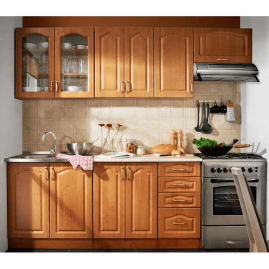 Kuchyňská sestava LORA MDF NEW KLASIK Materiálové provedení: DTD laminovaná / MDF foliovaná Barevné provedení: olše Horní část (ŠxV): 240x73,5 cm Na pravé horní straně: skleněná skříňka Nad digestoří je skříňka se šířkou 60 cm Ve střední horní části je dvoudveřová skříňka Ve střední horní části je skříňka se šířkou 40 cm Dolní část (ŠxV): 180x82 cm Tloušťka materiálu: 16 mm Na pravé dolní části: dřezová dvoudveřová skříňka Na levé dolní části: čtyři šuplíky Ve střední dolní části je dvoudveřová skříňka Dřezová skříňka dodávána bez pracovní desky a dřezu Dodávané v demontu. Dřezová skříňka dodávána bez pracovní desky. Možnost dokoupení ruzných sektorových skríněk,koruny a univerzálního L/P dřezu. Cena za 1 bm pracovní desky ke LORA MDF klasik olše je 1.450 Kč. Ceny spodních skřínek jsou bez pracovní desky. Cena za 1 bm koruny je 590 Kč a koruny na W60/60 je 590 Kč Požadovaný rozměr ozdobné lišty napište do poznámky v objednávce. Horní skříňky se nemontují na lištu, ale věší se na háčky. Háčky do zdi nejsou součástí balení, je třeba si je dokoupit.