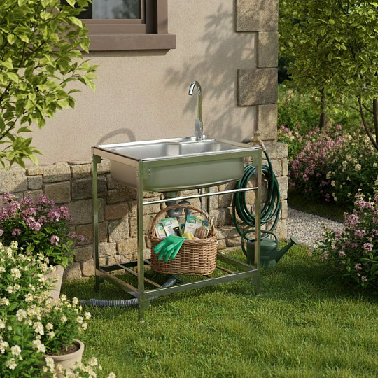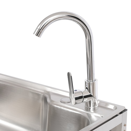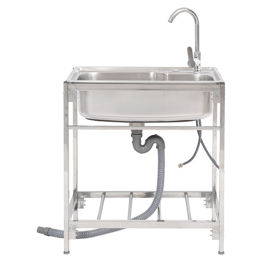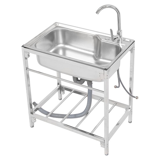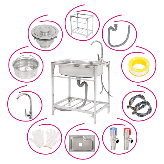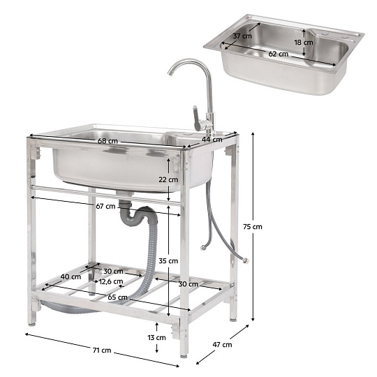 Materiál: nerezová ocel 201 Barva: stříbrná Rozměry dřezu (ŠxHxV): 68x44x18 cm Vnitřní rozměry dřezu (ŠxHxV): 62x37x18 cm Rozměry stojanu (ŠxHxV): 71x47x75 cm Tloušťka nerezového plechu: 0,5 mm Jednokomorový Černý nátěr na spodní straně Nátěr slouží k ochraně před vlhkostí a tlumení hluku Obdélníkový Univerzální Vhodný pro venkovní použití Dodáván se stojanem Jedna odkládací plocha Rozměry odkládací plochy (ŠxHxV): 65x40x30 cm Nosnost odkládací plochy: 8 kg Průměr sifonu: 3 cm Výrobek obsahuje: Nerezový dřez Stojan pod dřez Kuchyňská baterie pro teplou a studenou vodu Odtoková souprava se sítkem Sifonová odtoková hadice Hadice pro přívod vody Rohové ventily Sítko/košík do odtoku Hubkový těsnící pás Ochranné pracovní rukavice