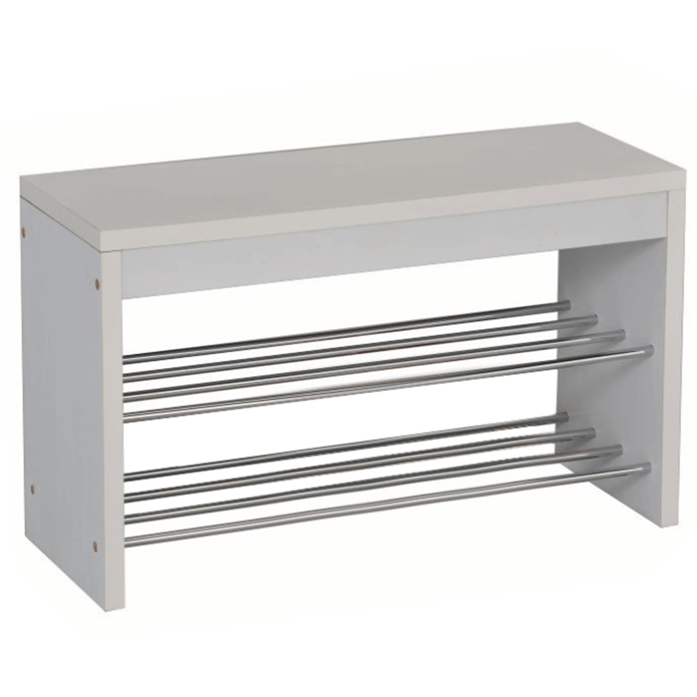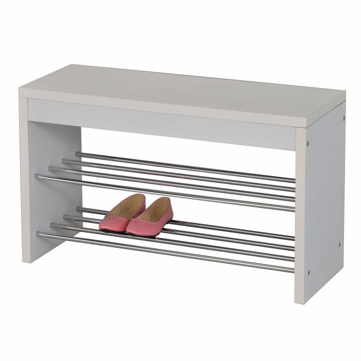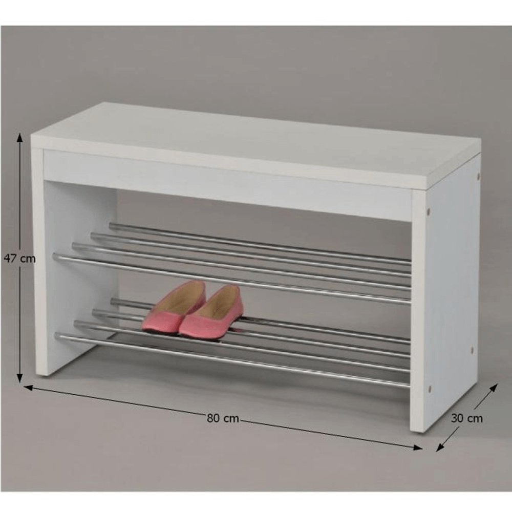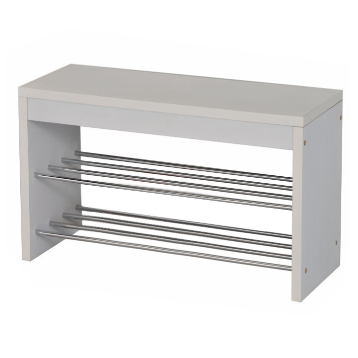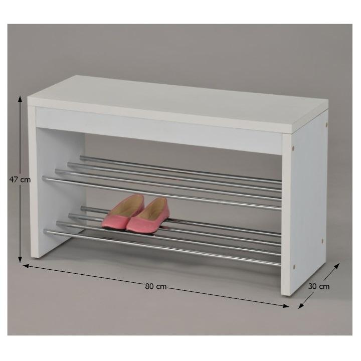 Lavice s botníkem LUSIA Barva: bílá / chromovaná Materiál: MDF / kov Rozměry (ŠxHxV): 80x30x47 cm Tloušťka materiálu: 25 mm Nosnost do 100 kg. Dodávané v demontu.