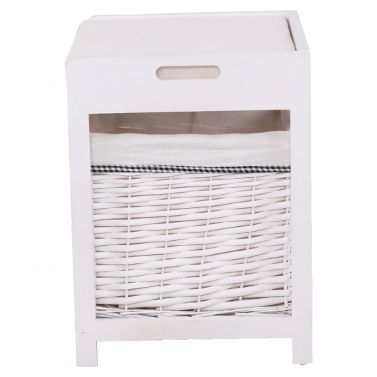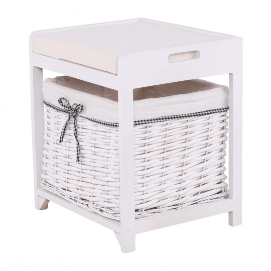 Praktická lavice s proutěným košíkem a polštářem na vrchu Materiál dřevo / proutí, barevné provedení: starobílá Rozměry (ŠxVxH) 40x45x34 cm.