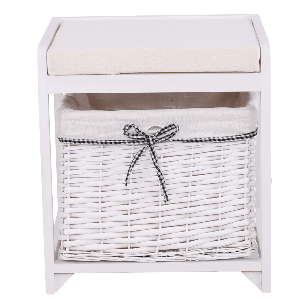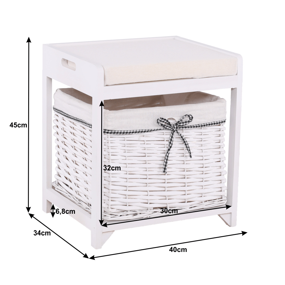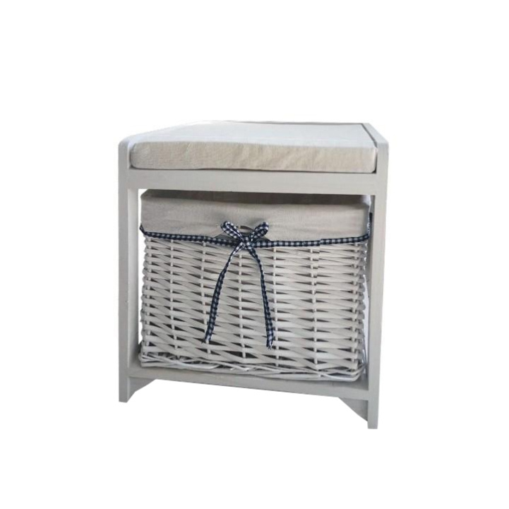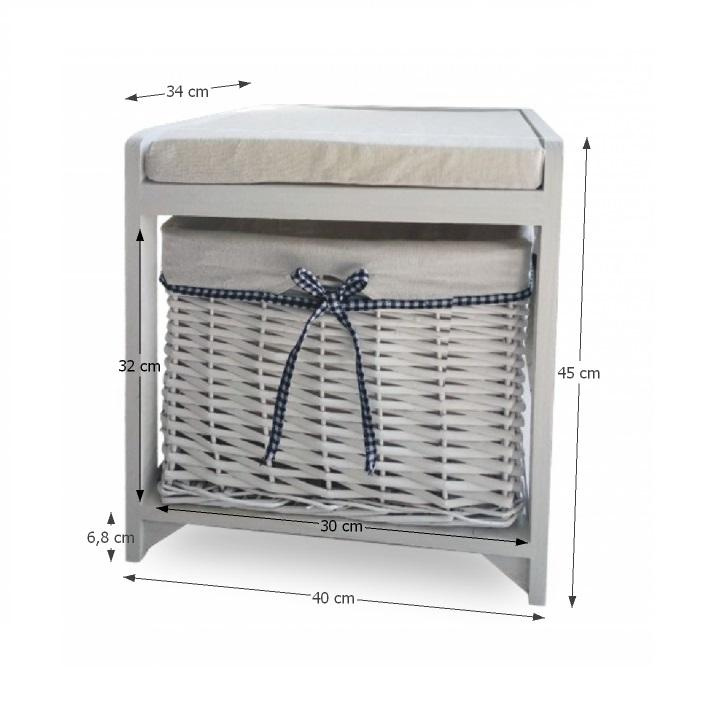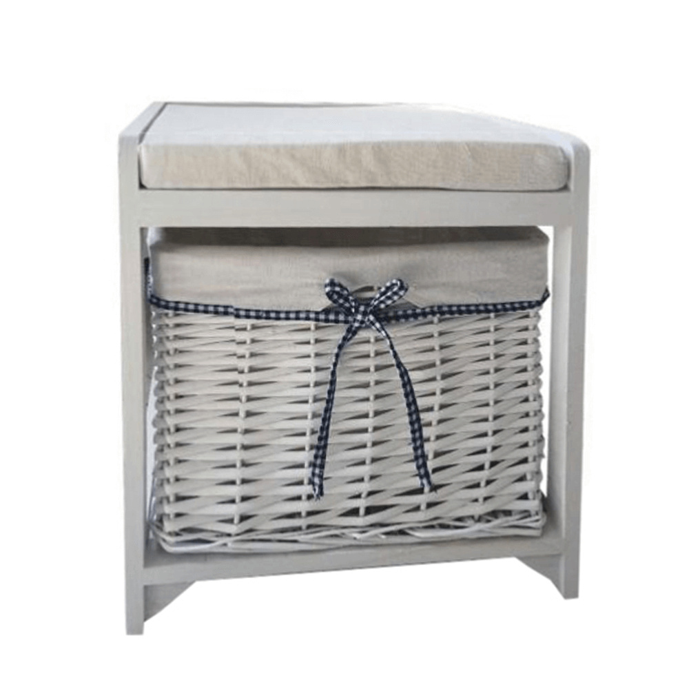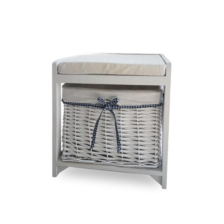 Praktická lavice s proutěným košíkem a polštářem na vrchu Materiál dřevo / proutí, barevné provedení: starobílá Rozměry (ŠxVxH) 40x45x34 cm.