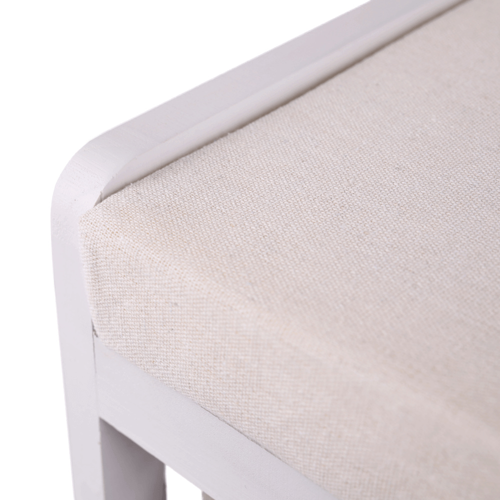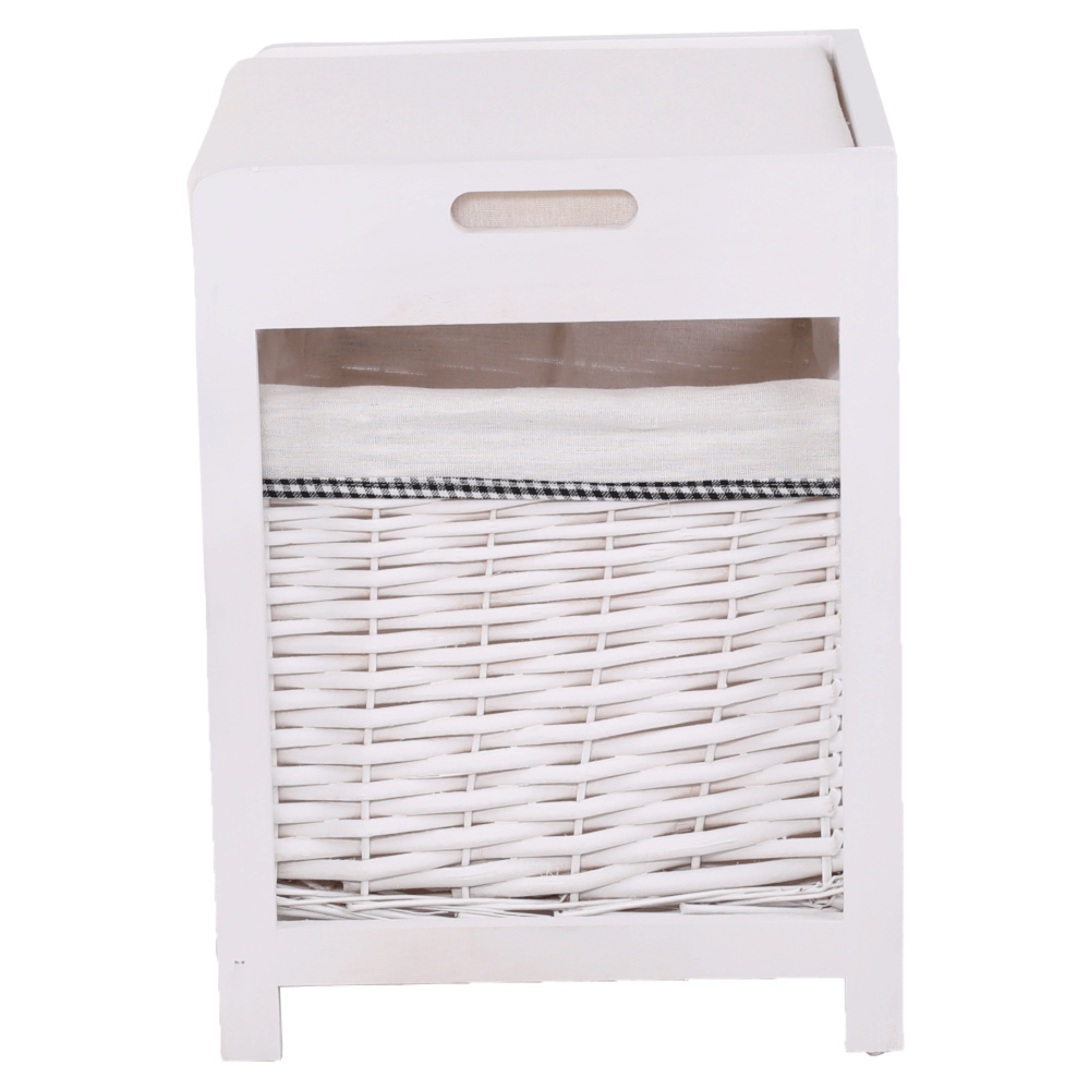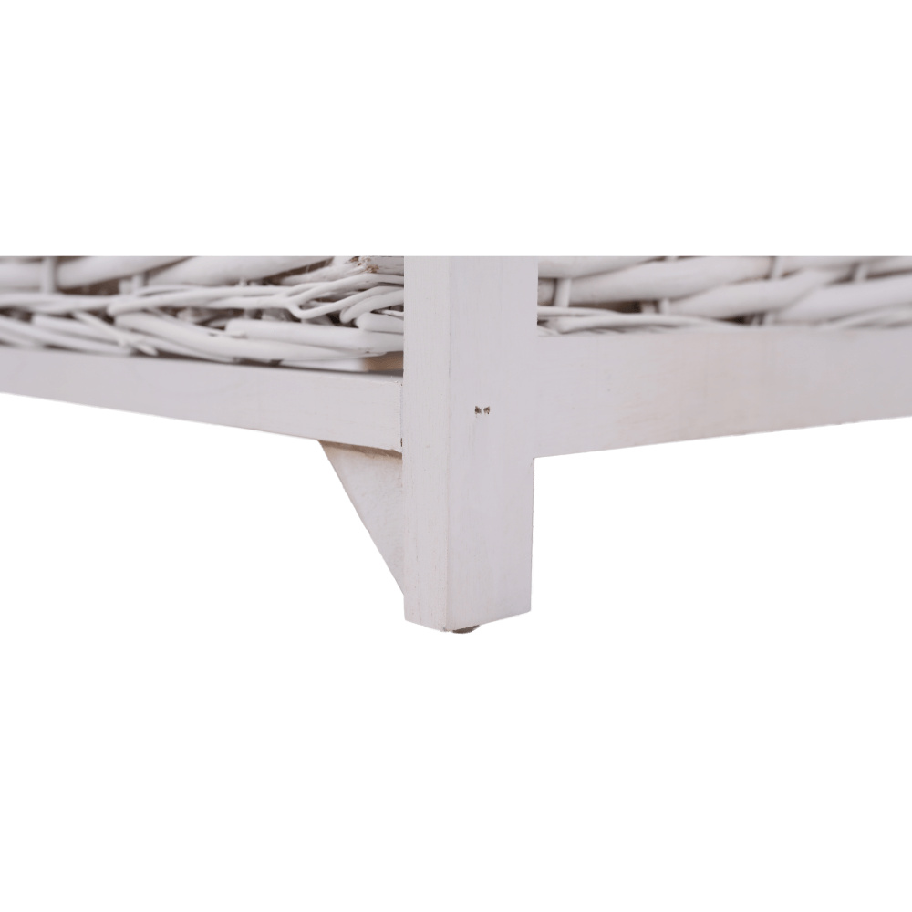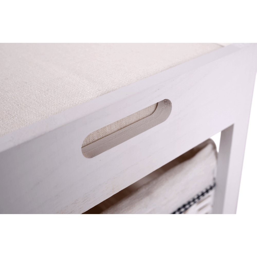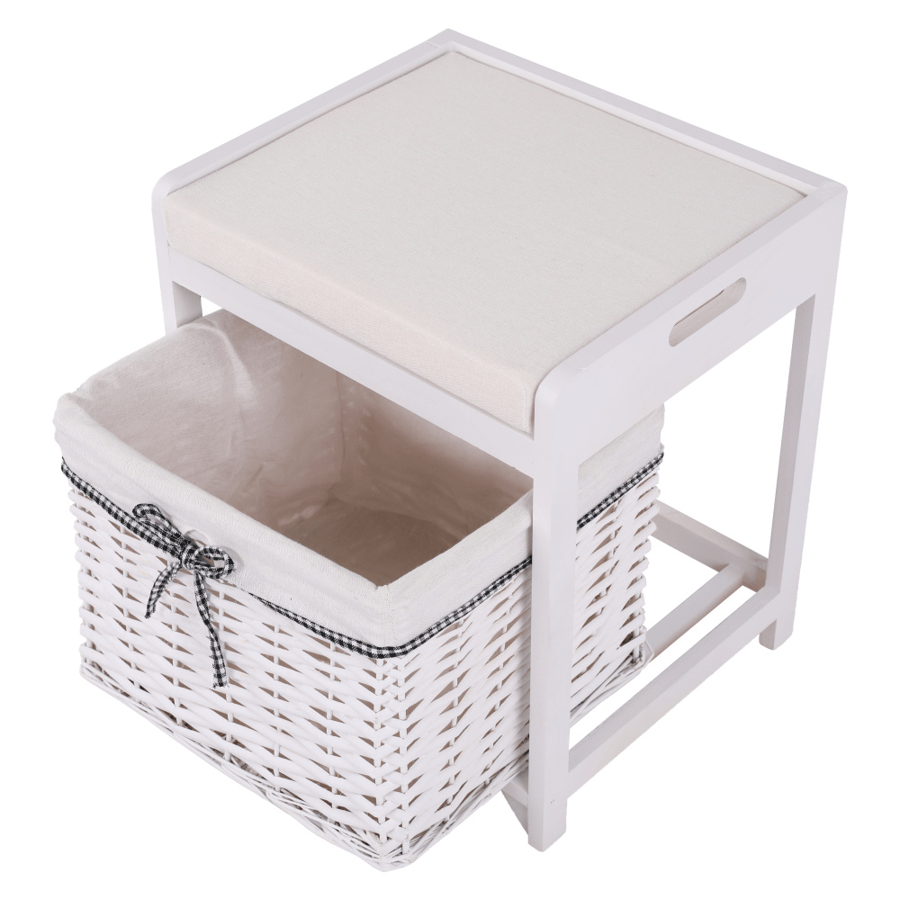 Praktická lavice s proutěným košíkem a polštářem na vrchu Materiál dřevo / proutí, barevné provedení: starobílá Rozměry (ŠxVxH) 40x45x34 cm.