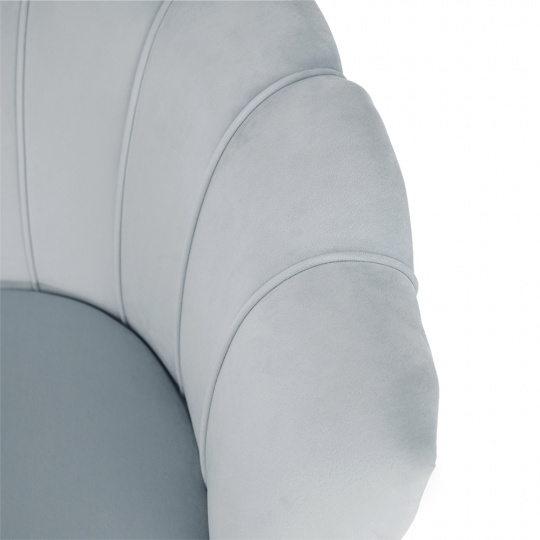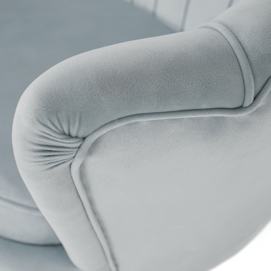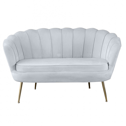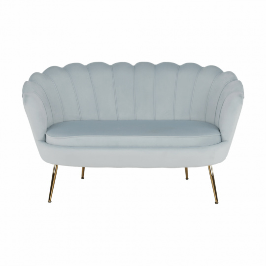Materiál sedadlo: látka Velvet Oděruodolnost textilie podle testu Martindale: 80 000 oděrek Barva: šedomodrá Materiál nohy: kov Barva: gold chrom-zlatý Rozměry (ŠxHxV): 135x75x78 cm Výška sedu: 43 cm Hloubka sedu: 58 cm Nosnost: 180 kg Nohy zakončené ohebnými kluzáky na vyrovnání nerovnosti povrchu designová Ve stylu Art-deco Ve tvaru mušle moderně zpracovaná Dodávané v demontu