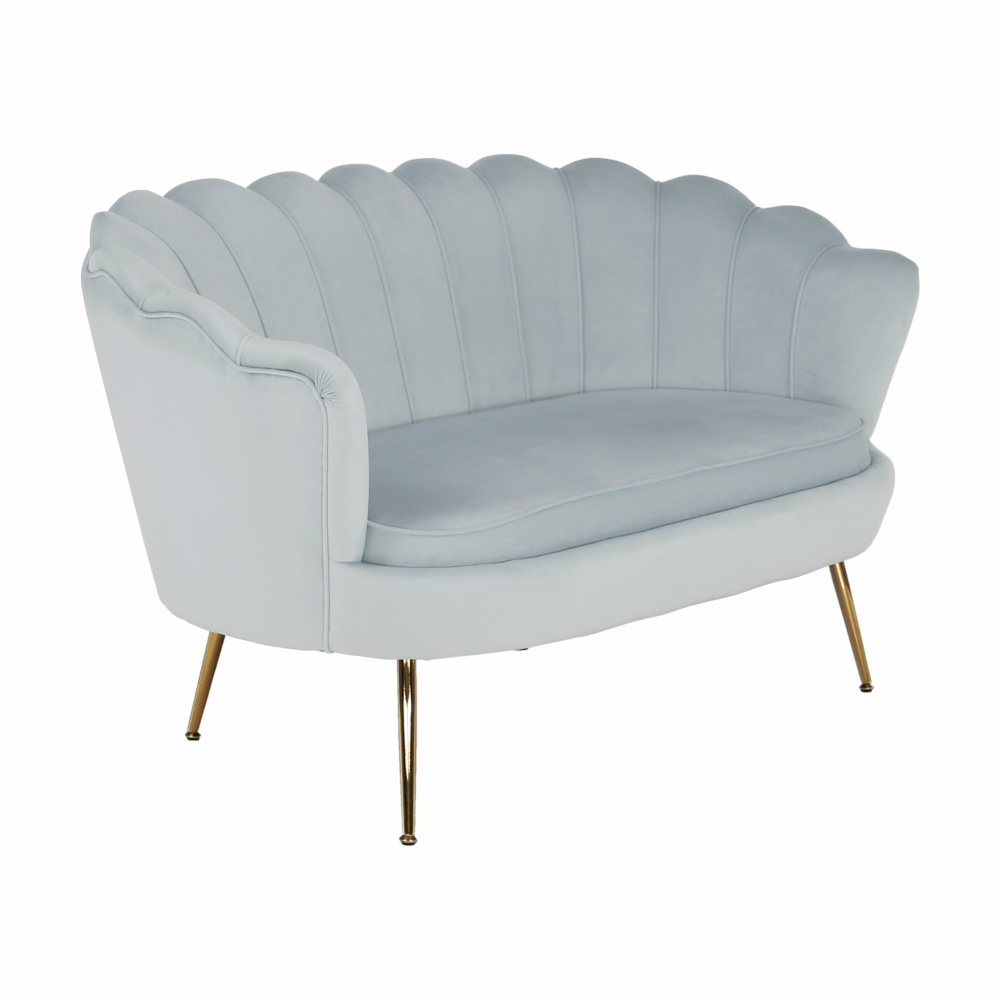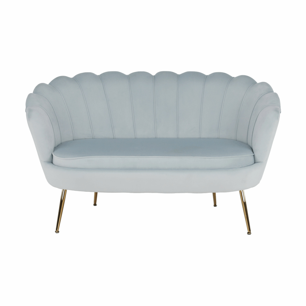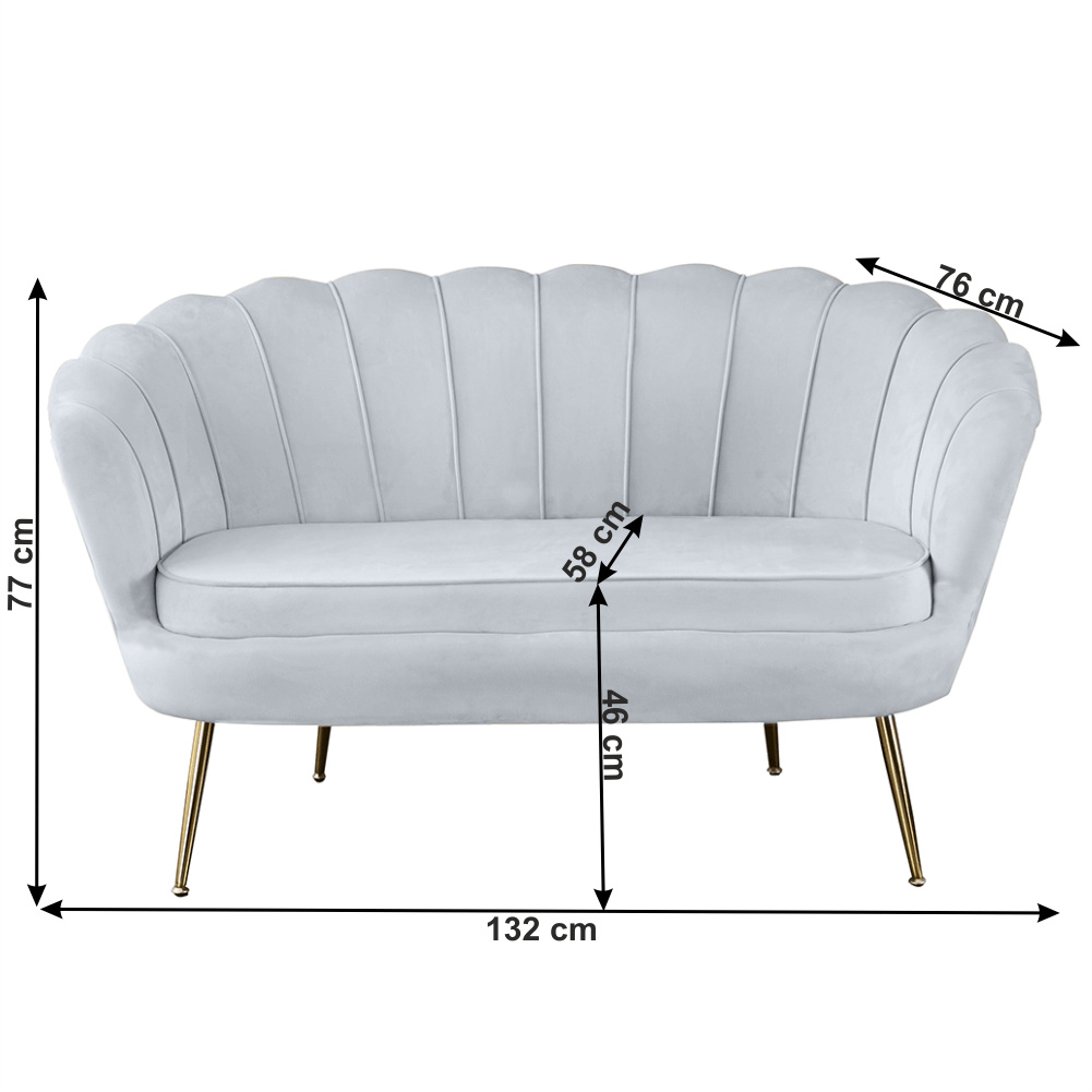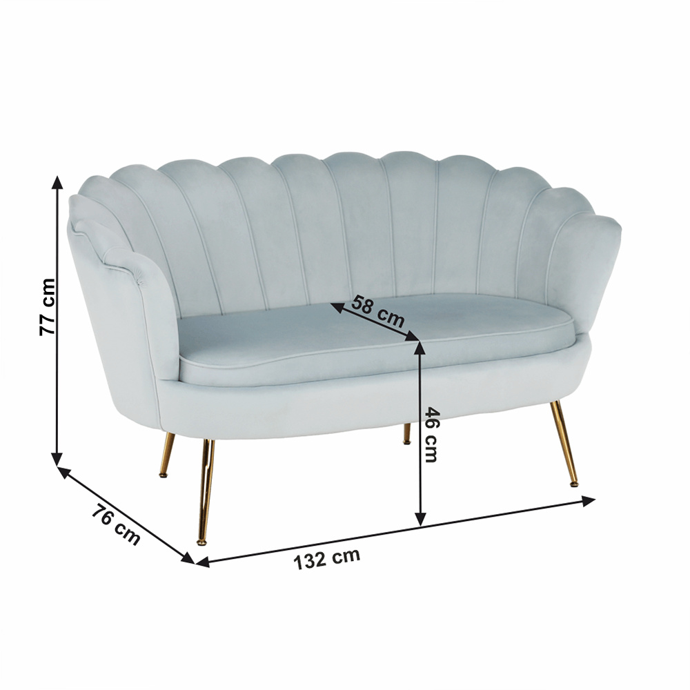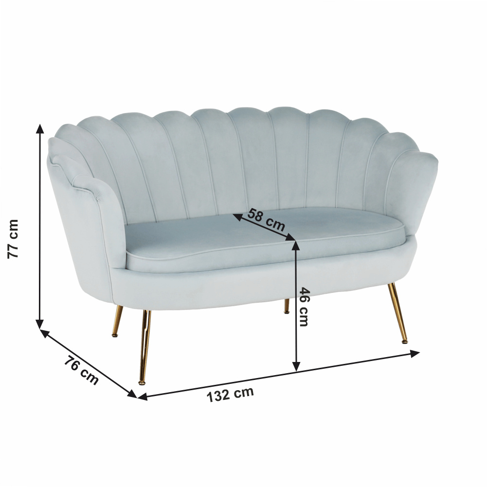 Materiál sedadlo: látka Velvet Oděruodolnost textilie podle testu Martindale: 80 000 oděrek Barva: šedomodrá Materiál nohy: kov Barva: gold chrom-zlatý Rozměry (ŠxHxV): 135x75x78 cm Výška sedu: 43 cm Hloubka sedu: 58 cm Nosnost: 180 kg Nohy zakončené ohebnými kluzáky na vyrovnání nerovnosti povrchu designová Ve stylu Art-deco Ve tvaru mušle moderně zpracovaná Dodávané v demontu