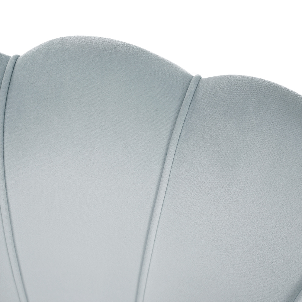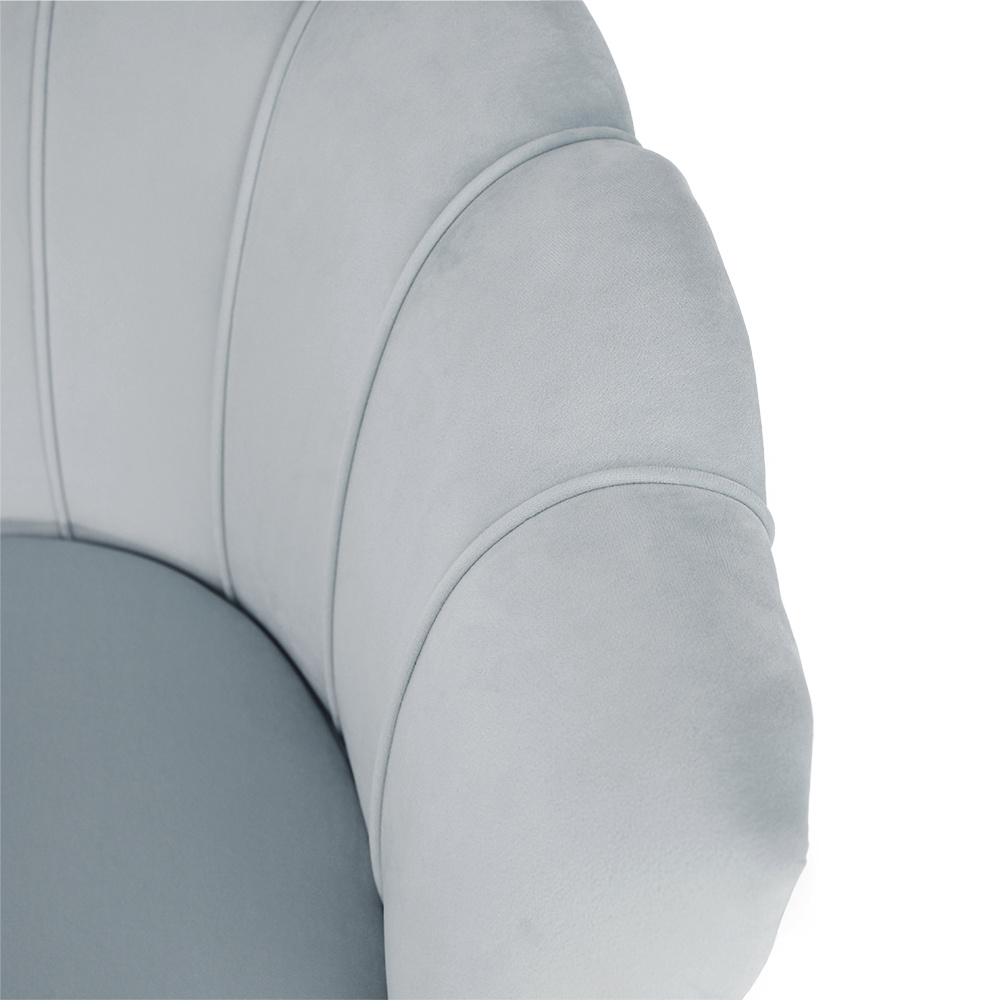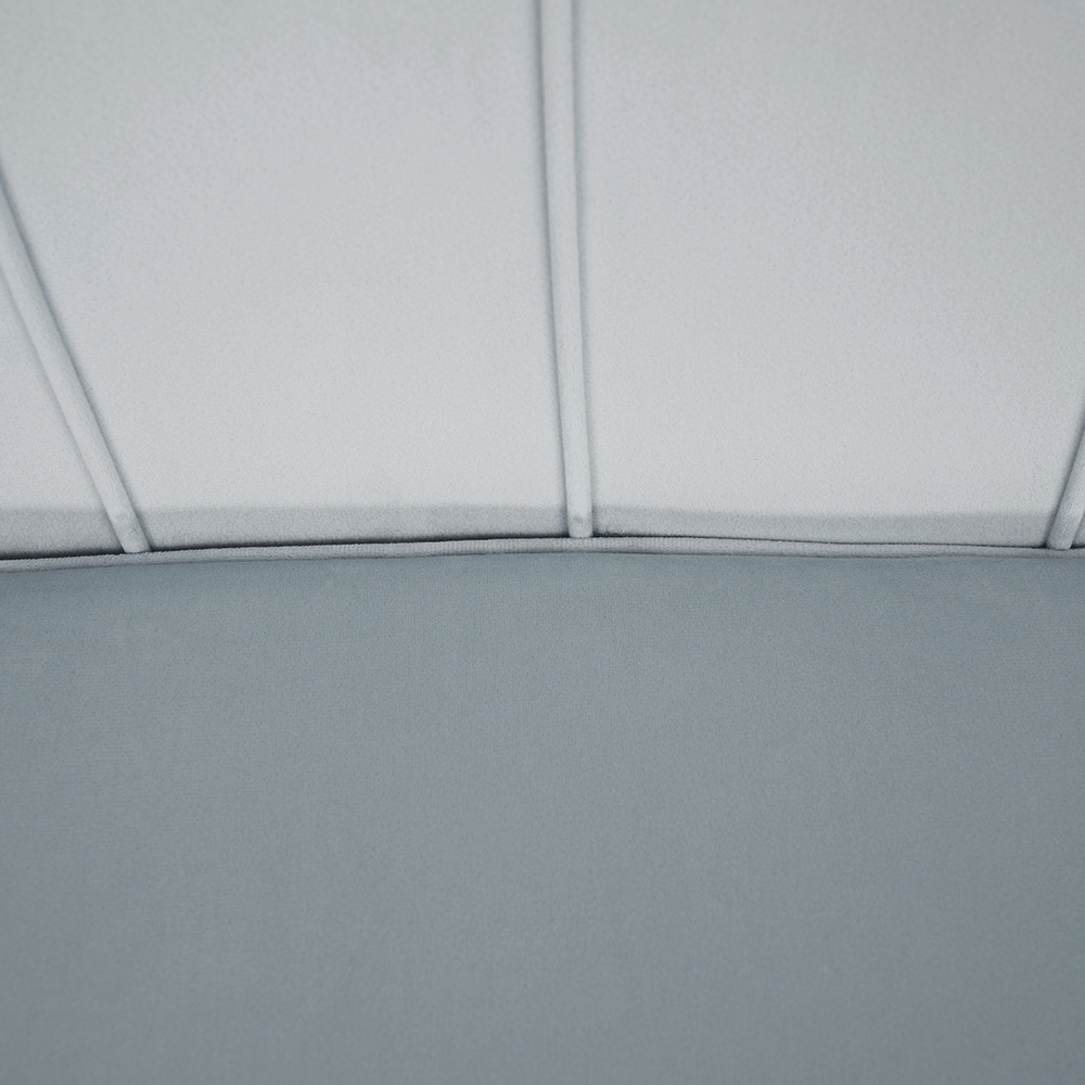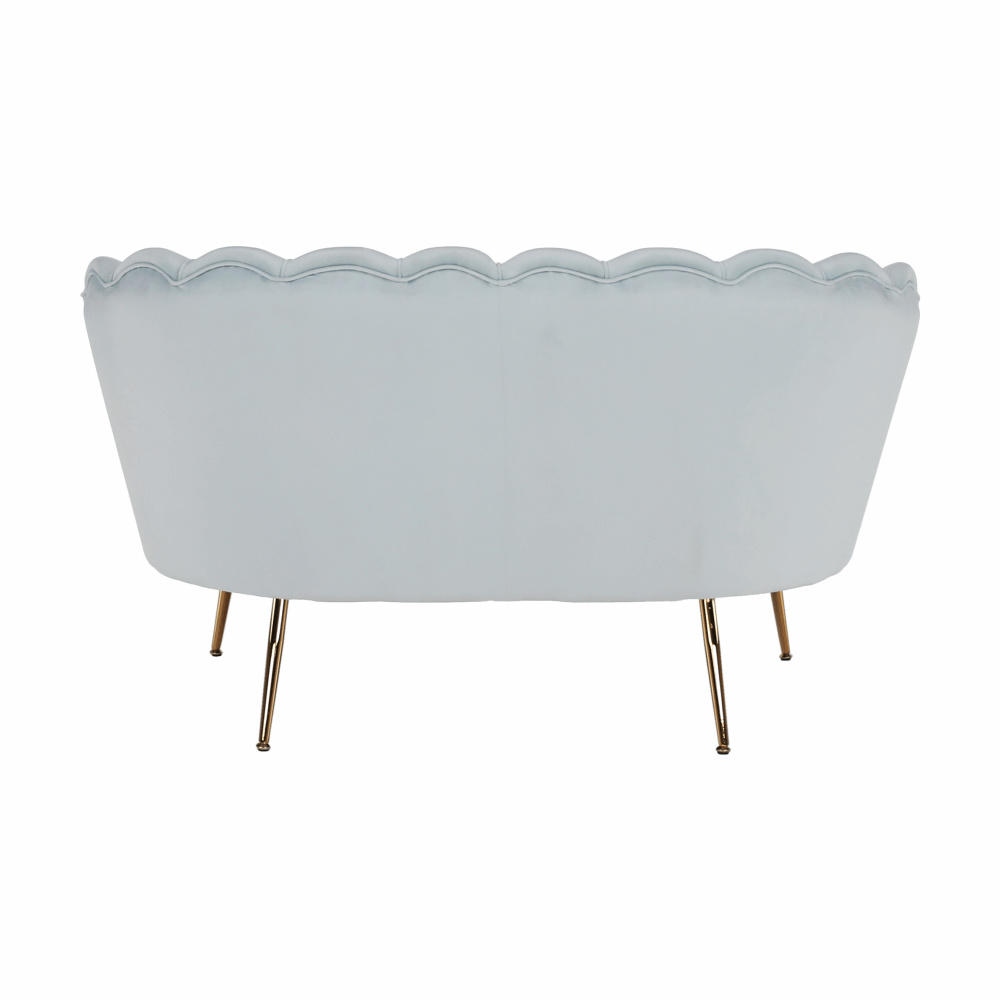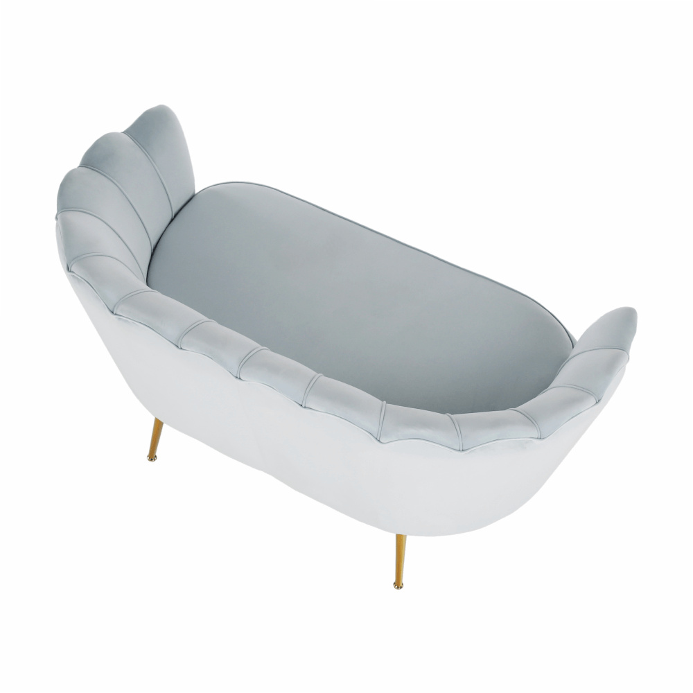 Materiál sedadlo: látka Velvet Oděruodolnost textilie podle testu Martindale: 80 000 oděrek Barva: šedomodrá Materiál nohy: kov Barva: gold chrom-zlatý Rozměry (ŠxHxV): 135x75x78 cm Výška sedu: 43 cm Hloubka sedu: 58 cm Nosnost: 180 kg Nohy zakončené ohebnými kluzáky na vyrovnání nerovnosti povrchu designová Ve stylu Art-deco Ve tvaru mušle moderně zpracovaná Dodávané v demontu