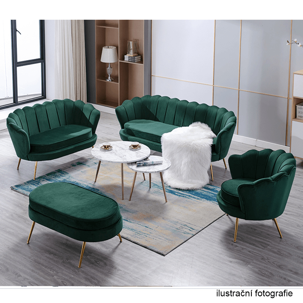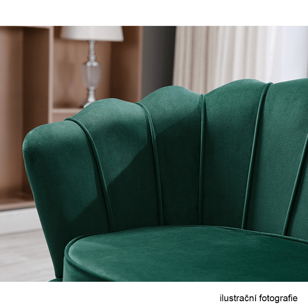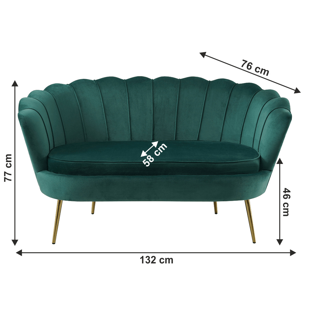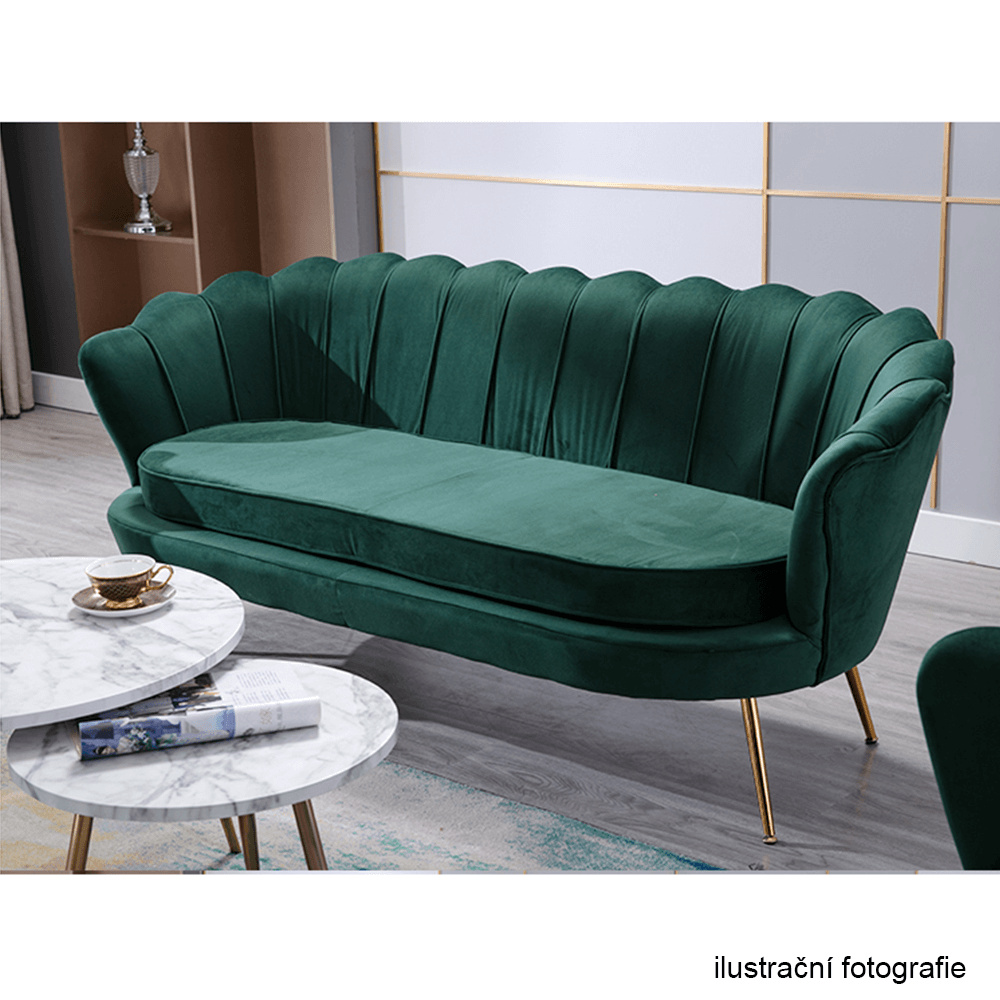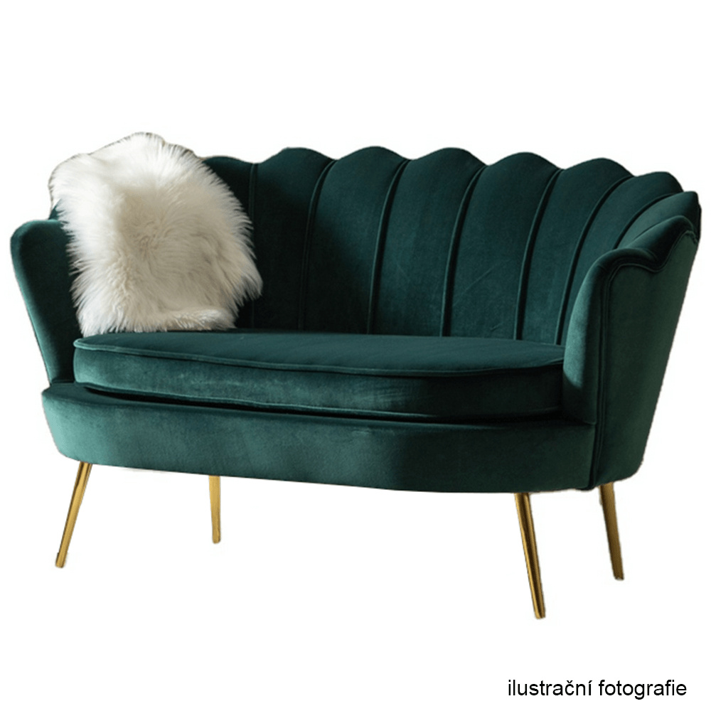 Materiál sedadlo: látka Velvet Oděruodolnost textilie podle testu Martindale: 80 000 oděrek Barva: smaragdová 18 Materiál nohy: kov Barva: gold chrom-zlatý Rozměry (ŠxHxV): 135x75x78 cm Výška sedu: 43 cm Hloubka sedu: 58 cm Nosnost: 180 kg Nohy zakončené ohebnými kluzáky na vyrovnání nerovnosti povrchu designová Ve stylu Art-deco Ve tvaru mušle moderně zpracovaná Dodávané v demontu