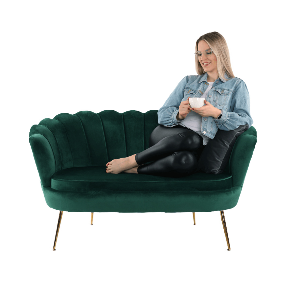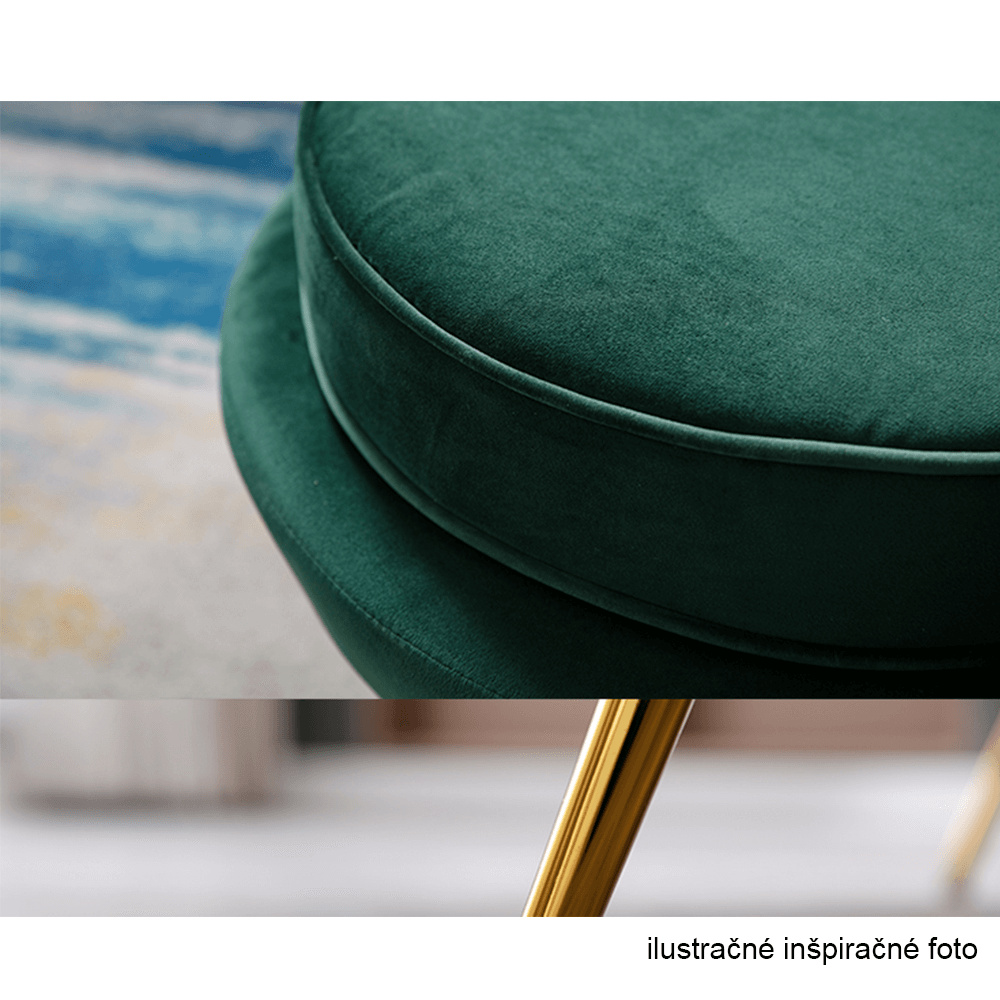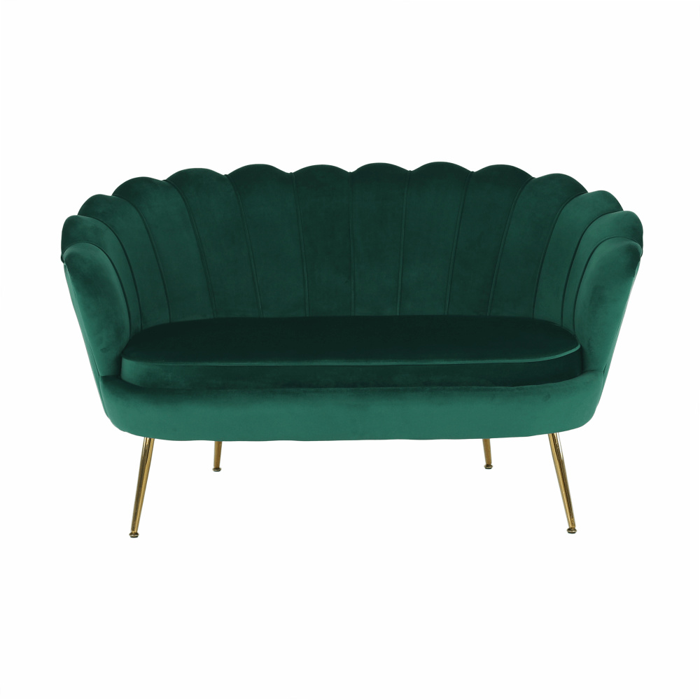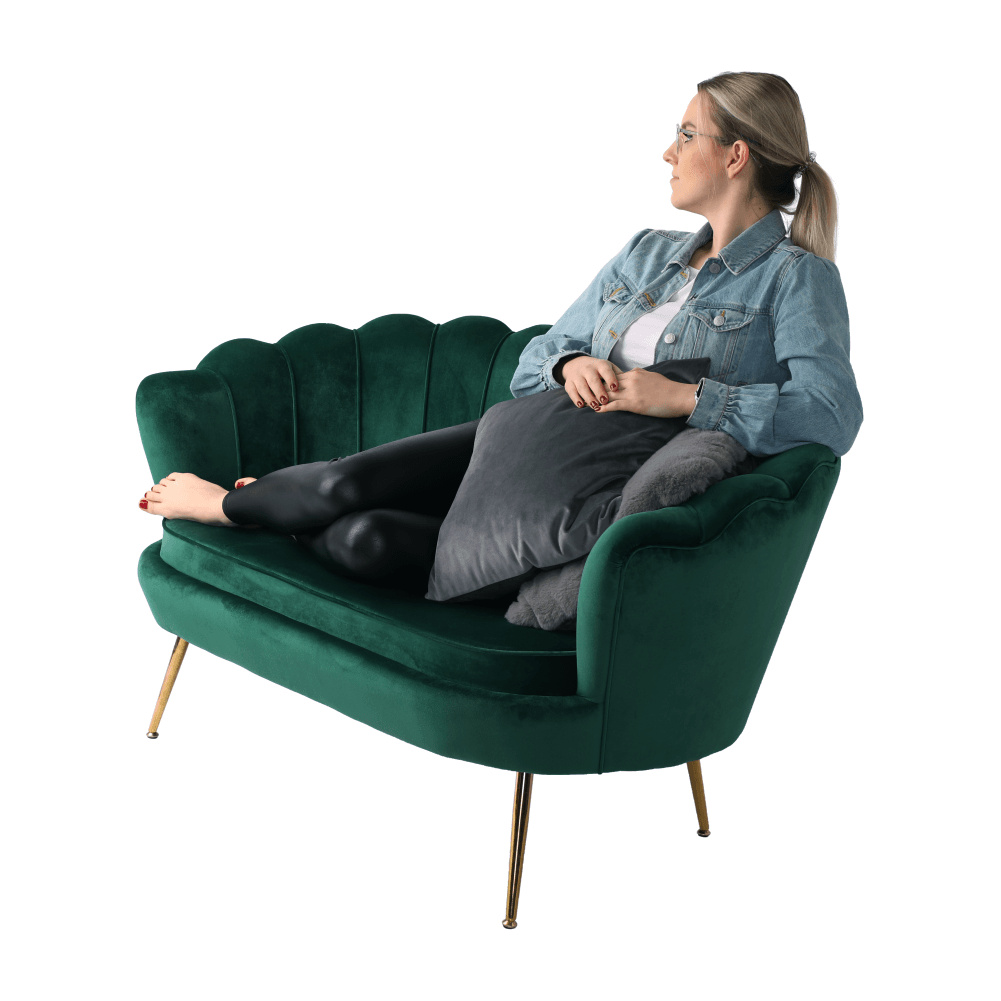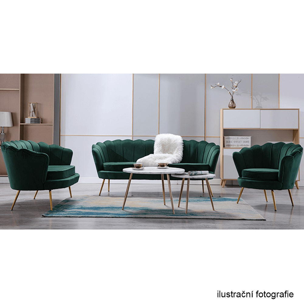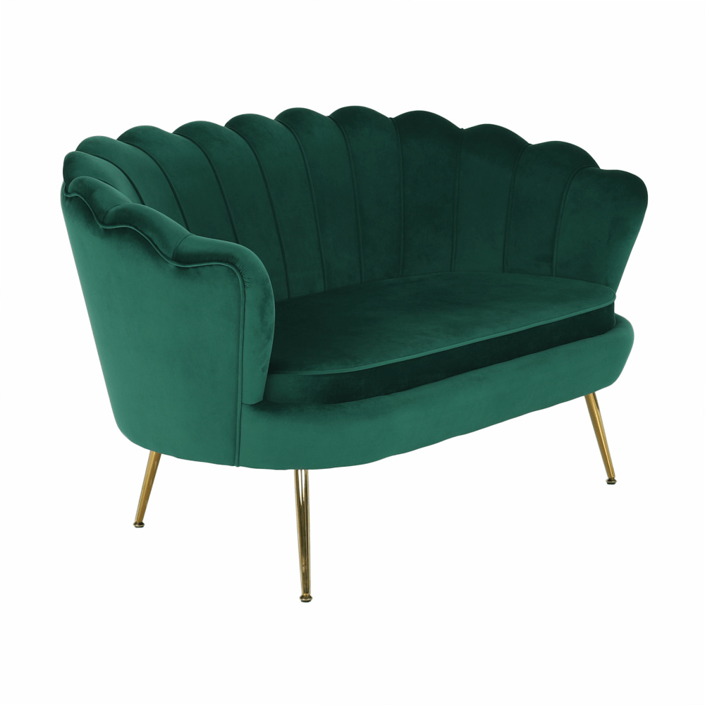Materiál sedadlo: látka Velvet Oděruodolnost textilie podle testu Martindale: 80 000 oděrek Barva: smaragdová 18 Materiál nohy: kov Barva: gold chrom-zlatý Rozměry (ŠxHxV): 135x75x78 cm Výška sedu: 43 cm Hloubka sedu: 58 cm Nosnost: 180 kg Nohy zakončené ohebnými kluzáky na vyrovnání nerovnosti povrchu designová Ve stylu Art-deco Ve tvaru mušle moderně zpracovaná Dodávané v demontu
