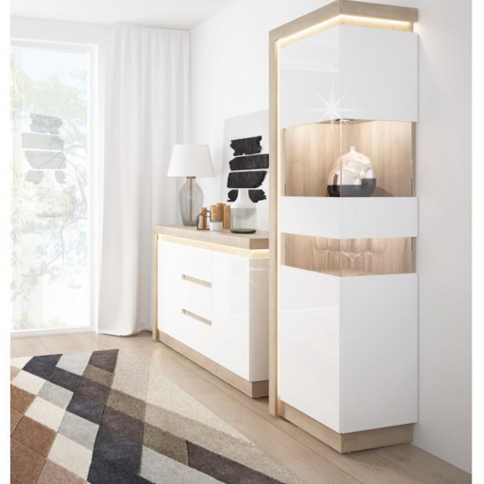 Vitrina LYOV01L, dub riviera / bílá s extra vysokým leskem, LEONARDO