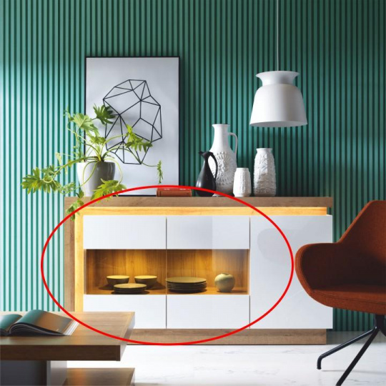 Komoda LYOK02 ze sektorové sestavy LEONARDO v provedení dub riviera / bílá s vysokým leskem. Rozměry (ŠxHxV): 158x89x42 cm Tloušťka materálu: 16 mm Systém tichého dorazu dvířek LED osvětlení po obvodu je v ceně Dodávané v demontu Hmotnost: 70kg