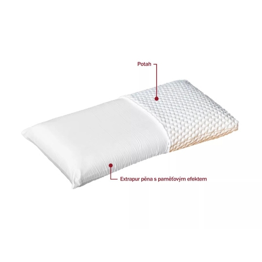 Poskytuje optimální oporu hlavy a úlevu krčním svalům během spánku. Pěna je ekologická a velmi prodyšná. Zachovává svůj tvar, je nedeformovatelná a příjemně měkká.