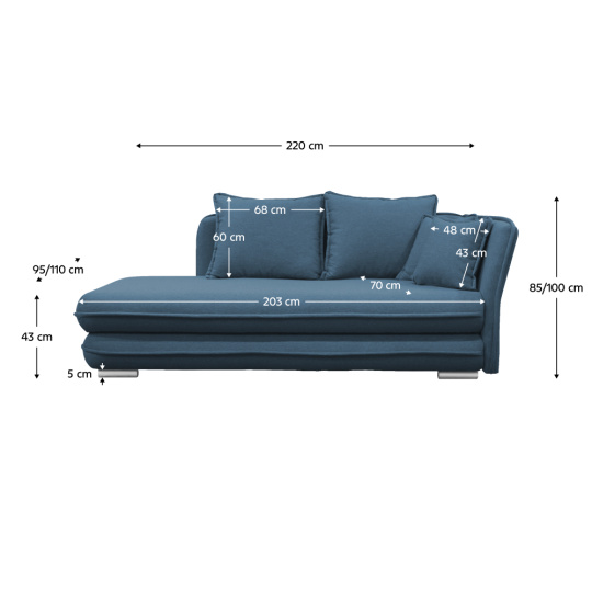Materiál: látka Whisper 12 Oděruodolnost textilie podle testu Martindale: 68 000 oděrů Barva: modrá Rozmery (ŠxHxV): 224x98/107x99 cm Výška sedu: 45 cm Hĺbka sedu: 95 cm Šírka sedu: 203 cm Plastové nožičky Farba nožičiek: strieborná Výška spodného priestoru od podlahy: 5 cm Plocha na spanie (ŠxD): 95x203 cm Nosnosť: 100 kg Celočalúnená Jádro matrace: bonelová pružina S úložným priestorom Dodávaná s vankúšmi Rozmer veľkého vankúša (ŠxH): 68x60 cm Rozmer malého vankúša (ŠxH): 48x43 cm Dodávané v demonte Nabízíme vám možnost objednat si lenošku v 8 barevných provedeních látky Whisper v ceně: 18.890 Kč. Při individuální objednávce je třeba zaplatit 20% zálohu z dané částky. Po uhrazení zálohy bude Váš požadavek zadán do výroby. Doba dodání 6-8 týdnů.