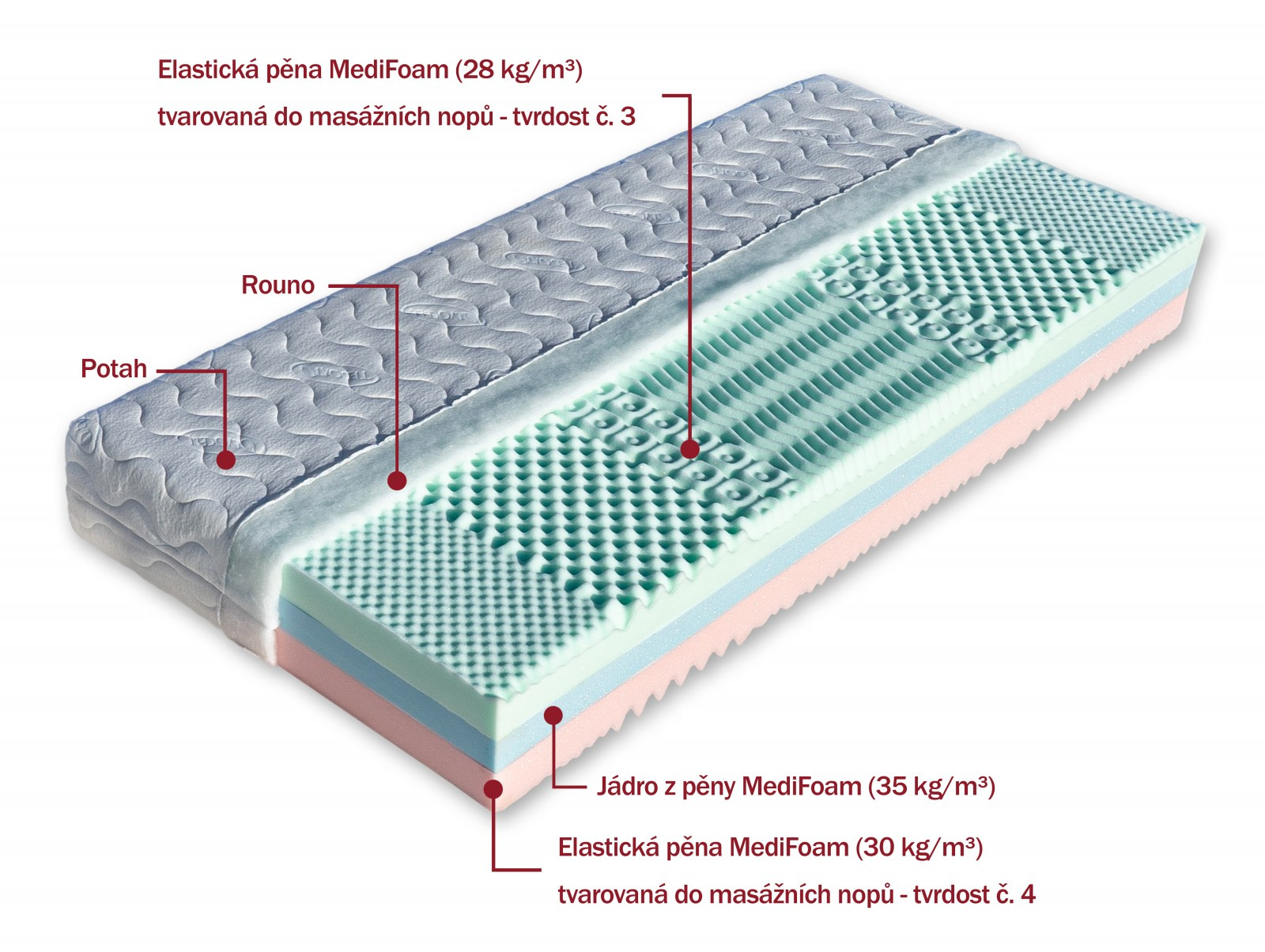 Sedmizónová matrace s volbou dvojí tuhosti. Střed jádra matrace je zpevněn vysoce gramážní pěnou MediFoam (35 kg/m³). Nosné vrstvy (28 a 30 kg/m³) jsou tvořeny kvalitními elastickými pěnami, které jsou tvarovány do masážních nopů. Nopy zabezpečují prokrvení pokožky a uvolnění svalů během spánku. Matrace je vhodná na všechny typy roštů.