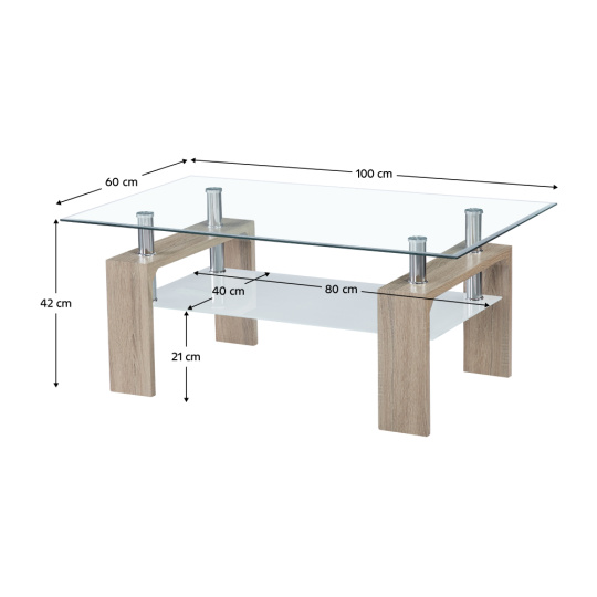 Konferenční stolek LIBOR 2 NEW Materiál: MDF fóliovaná/tvrzené sklo Provedení: dub sonoma/čiré sklo/mléčné sklo Rozměry (ŠxHxV): 100x60x42 cm Rozměry police (ŠxH): 80x40 cm Tloušťka materiálu MDF: 2 cm Tloušťka vrchního skla: 6 mm Tloušťka spodního skla: 5 mm Dodáván v demontu