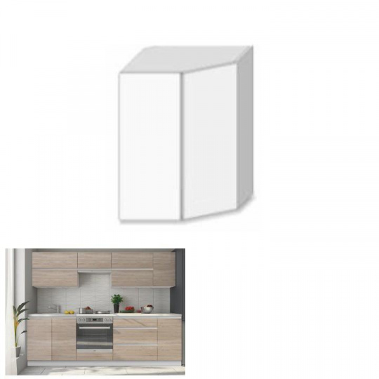 Horní rohová skříňka GR LINE Materiál: DTD laminovaná Provedení: dub sonoma / bílá Rozměry (ŠxHxV): 52,5x52,5x60 cm S dvířky úložný prostor moderní design Dodávané v demontu. Možnost dokoupit dřez LAY ON. Možnost dokoupit pracovní desku 38 mm v ceně 1.650 Kč / bm.