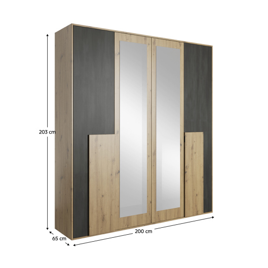 Materiál: DTD laminovaná/ABS hrany Barva: dub artisan Skříň Rozměry (ŠxHxV): 200x65x203 cm Čtyřdveřová Se dvěma zrcadly na prostředních dveřích 2x věšáková část 2x policová část Postel Rozměry (ŠxHxV): 170x205x100 cm Plocha na spaní: 160x200 cm Tloušťka materiálu: 16 mm Postel dodávána bez roštu a bez matrace Doporučený rošt v pevném rámu o rozměru 160x200 cm Noční stolek Rozměry (ŠxHxV): 54x40x40 cm 2 zásuvky Možnost dokoupit komodu a zrcadlo BAFRA Dodáváno v demontu