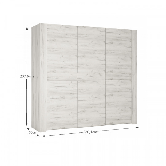 Materiál: laminovaná DTD Barva: bílá craft Skříň Rozměry (ŠxHxV): 220,1x60x207,5 cm 3dveřová Prostřední část obsahuje 5 polic Nosnost každé police: 5 kg Dvě věšákové části Postel Rozměry (ŠxHxV): 166,4x218x91,5 cm Plocha na spaní: 160x200 cm Noční stolek Rozměry (ŠxHxV): 49,1x40,2x37,6 cm Tloušťka materiálu: 16/28 mm Jedna otevřená police, jedna zásuvka Dodáváno v demontu
