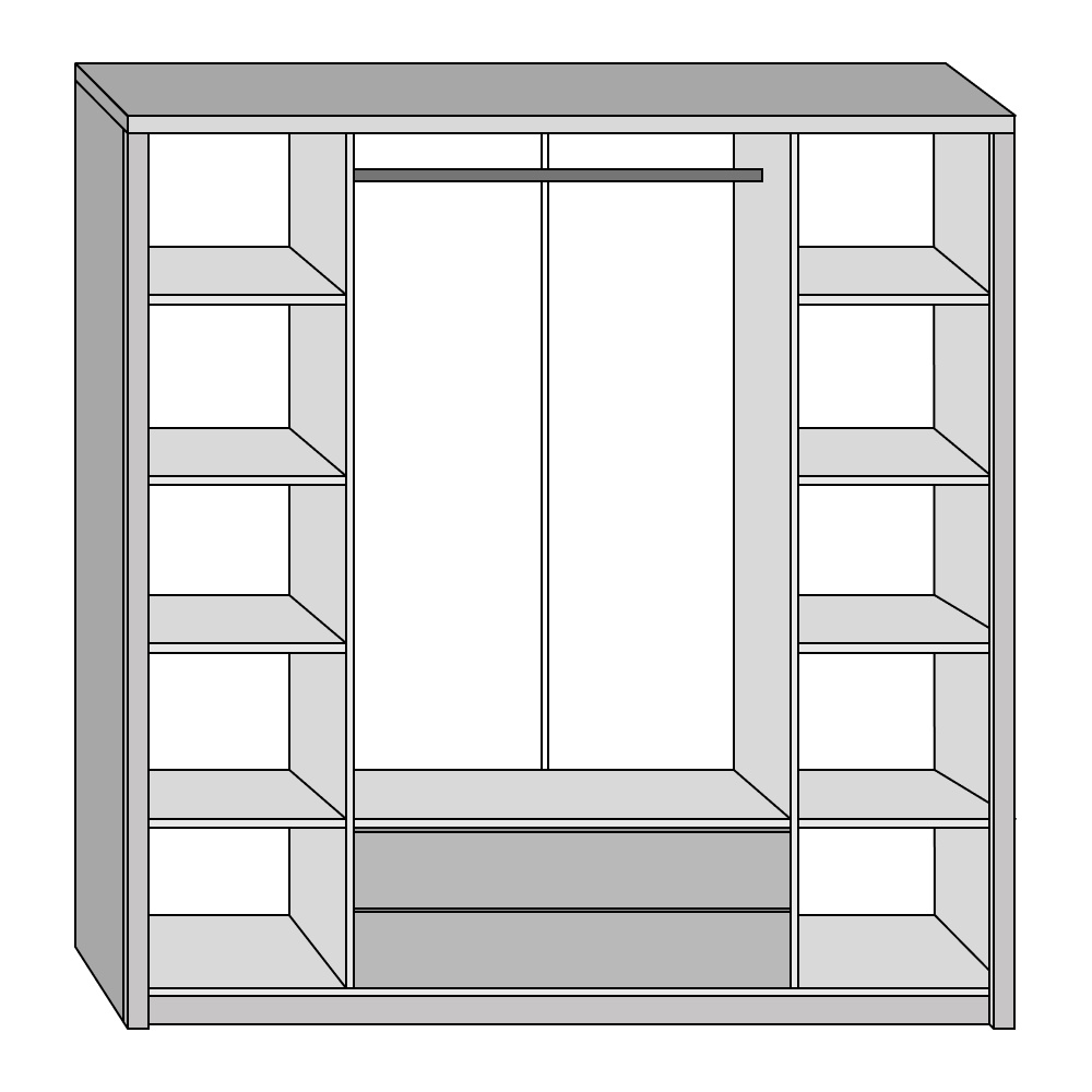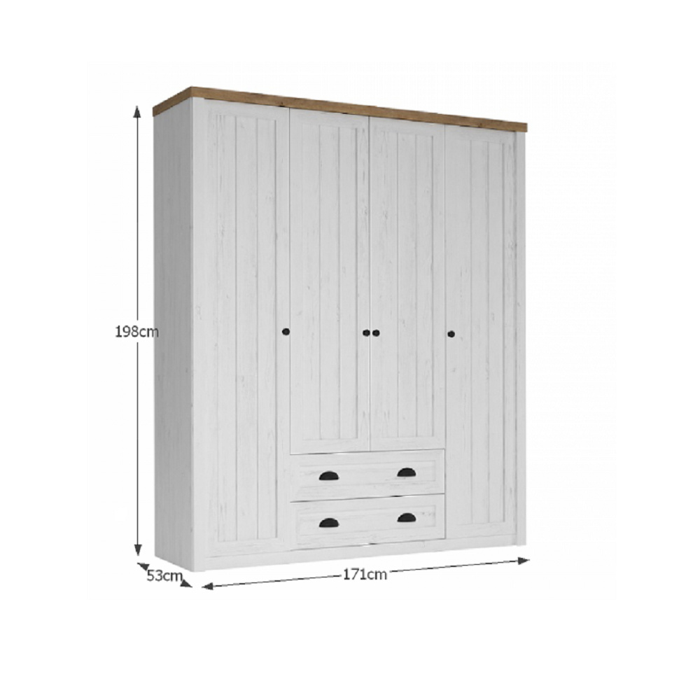 Materiál: laminovaná DTD Barva: sosna andersen/dub lefkas Skříň Rozměry (ŠxHxV): 171x53x198 cm 4-dveřová Jedna věšáková část Dvě policové části Dvě zásuvky Nosnost věšákové tyče: 10 kg Nosnost každé police: 7 kg Postel Rozměry (ŠxHxV): 165x205x100 cm Plocha na spaní: 160x200 cm Rošt je součástí balení Tloušťka materiálu postel: 22 mm Noční stolek Rozměry (ŠxHxV): 51x43x45 cm Tloušťka materiálu korpus: 15 mm Tloušťka materiálu horní desky: 36 mm Dodáváno v demontu