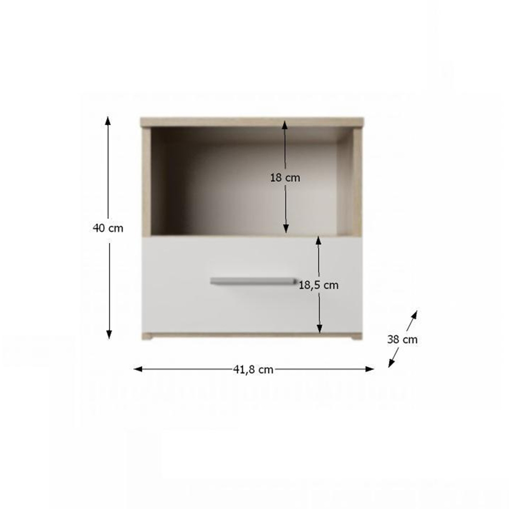 Materiál: DTD laminovaná Barva: dub sonoma/bílá Skříň Rozměry (ŠxHxV): 201,6x62x200 cm S posunovacími dveřmi Věšáková, s jednou policí na každé straně Postel Rozměry (ŠxHxV): 163,6x203,2x90 cm Plocha na spaní (ŠxH): 160x200 cm Výška vnitřní konstrukce: 26 cm Výška bočnice: 25 cm Výška spodní hrany bočnice od země: 14,9 cm Bočnice přesahuje vrchní hranu vnitřní konstrukce o: 13,9 cm Výška vrchní hrany bočnice od země: 40 cm Postel dodávána bez roštu a bez matrace Možnost dokoupit matraci a rošt v pevném rámu Noční stolek Rozměry (ŠxHxV): 41,8x38x40 cm S jednou zásuvkou a otevřenou odkládací plochou Výška zásuvky: 18,5 cm Výška otevřené odkládací plochy: 18 cm Tloušťka materiálu: 16/22 mm Kvalitní slovenský výrobek Dodáváno v demontu