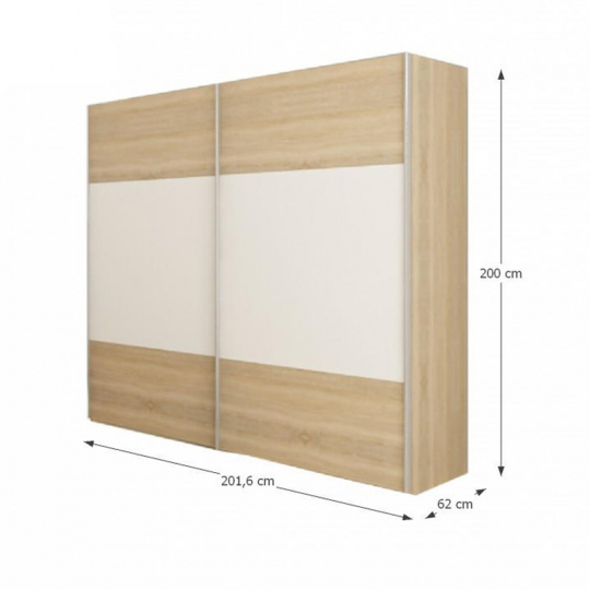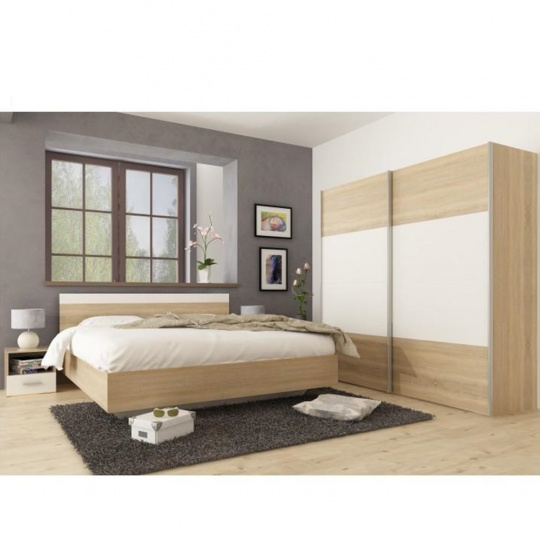 Materiál: DTD laminovaná Barva: dub sonoma/bílá Skříň Rozměry (ŠxHxV): 201,6x62x200 cm S posunovacími dveřmi Věšáková, s jednou policí v každé části Postel Rozměry (ŠxHxV): 183,6x203,2x90 cm Plocha na spaní (ŠxH): 180x200 cm Postel dodávána bez roštu a bez matrace Možnost dokoupit matraci a rošt v pevném rámu Noční stolek Rozměry (ŠxHxV): 41,8x38x40 cm S jednou zásuvkou a otevřenou odkládací plochou Výška zásuvky: 18,5 cm Výška otevřené odkládací plochy: 18 cm Tloušťka materiálu: 16/22 mm Kvalitní slovenský výrobek Dodáváno v demontu
