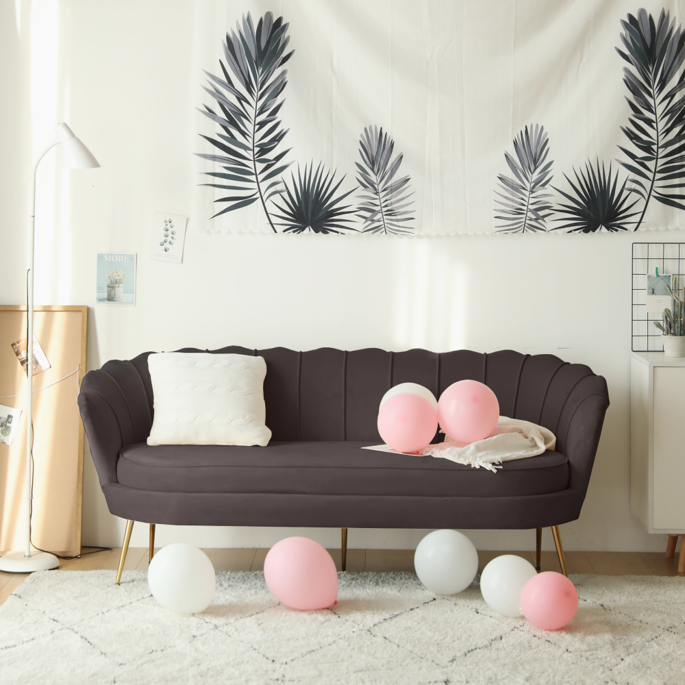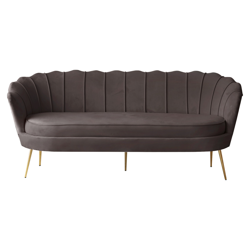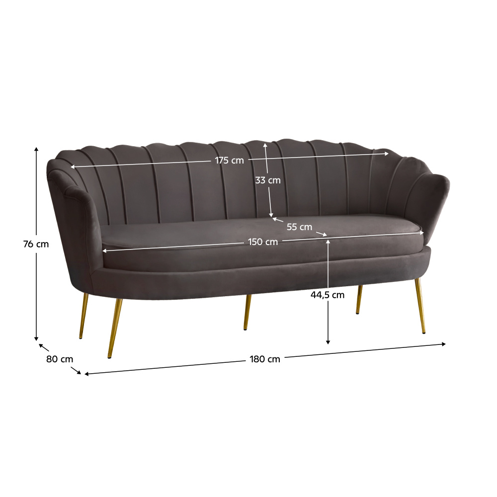 Materiál: látka Velvet/kov Oděruodolnost textilie podle testu Martindale: 80 000 oděrů Barva: šedohnědá/gold chrom zlatý Rozměry (ŠxHxV): 180x80x76 cm Výška sedu: 44,5 cm Hloubka sedu: 55 cm Šířka sedu: 150 cm Výška zádové opěrky: 33 cm Šířka zádové opěrky: 175 cm Nosnost: 250 kg Hmotnost: 25 kg Výplň: pěna Designové Ve stylu Art-deco Ve tvaru mušle Celočalouněné Dekorativní prošívání Dodáváno v demontu