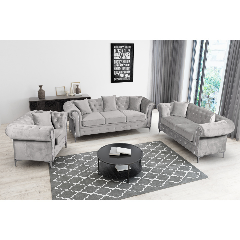 Materiál čalounění: látka Velvet 03 Oděruodolnost látky podle testu Martindale: 50 000 oděrů Barva čalounění: světle šedá Rozměry (ŠxHxV): 185x88x73 cm Plocha na spaní (ŠxD): 113x190 cm Výška sedu: 46,6 cm Hloubka sedu: 55 cm Na kovových nožičkách Barva nožiček: stříbrná Výška spodního prostoru od podlahy: 9 cm Nosnost na osobu: 120 kg Výplň: pružina falista Tvrdost: T30 Celočalouněný Noblesní Luxusní Chesterfield Prošívaný Rozkládací Dekorativní knoflíky Barva dekorativních knoflíků: stříbrná Dodáván se dvěma polštáři Sedací část se suchým zipem Dodáván v demontu Možnost objednání v 5 barevných odstínech látky Velvet s dodací lhůtou 8-10 týdnů. Při individuální objednávce je třeba zaplatit 20% zálohu z dané částky. Po uhrazení zálohy bude Váš požadavek zadán do výroby.