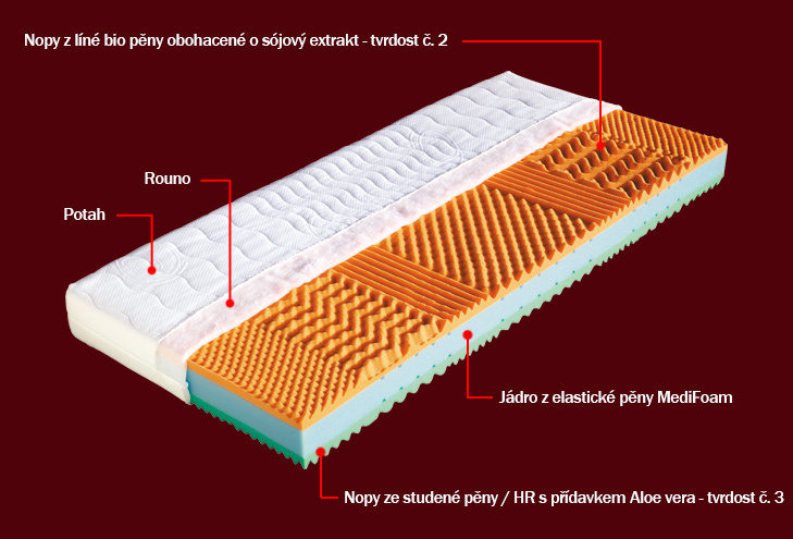 Kvalitní sedmizónová matrace, jejíž nosné vrstvy tvoří kombinace studené / HR a oblíbené viscoelastické pěny. Oranžová nosná vrstva tvarovaná do masážních nopů je tvořena z viscoelastické pěny obohacené o sójový extrakt. Použitím této pěny se snižuje protitlak matrace na ležící tělo. Zelená nosná vrstva tvarovaná do masážních nopů je tvořena z kvalitní studené pěny / HR s přídavkem Aloe vera, které má příznivý vliv na pokožku. Jádro matrace tvoří elastická pěna MediFoam, která je provzdušněna otvory zaručujícími ventilaci a změkčení matrace v oblasti ramen.