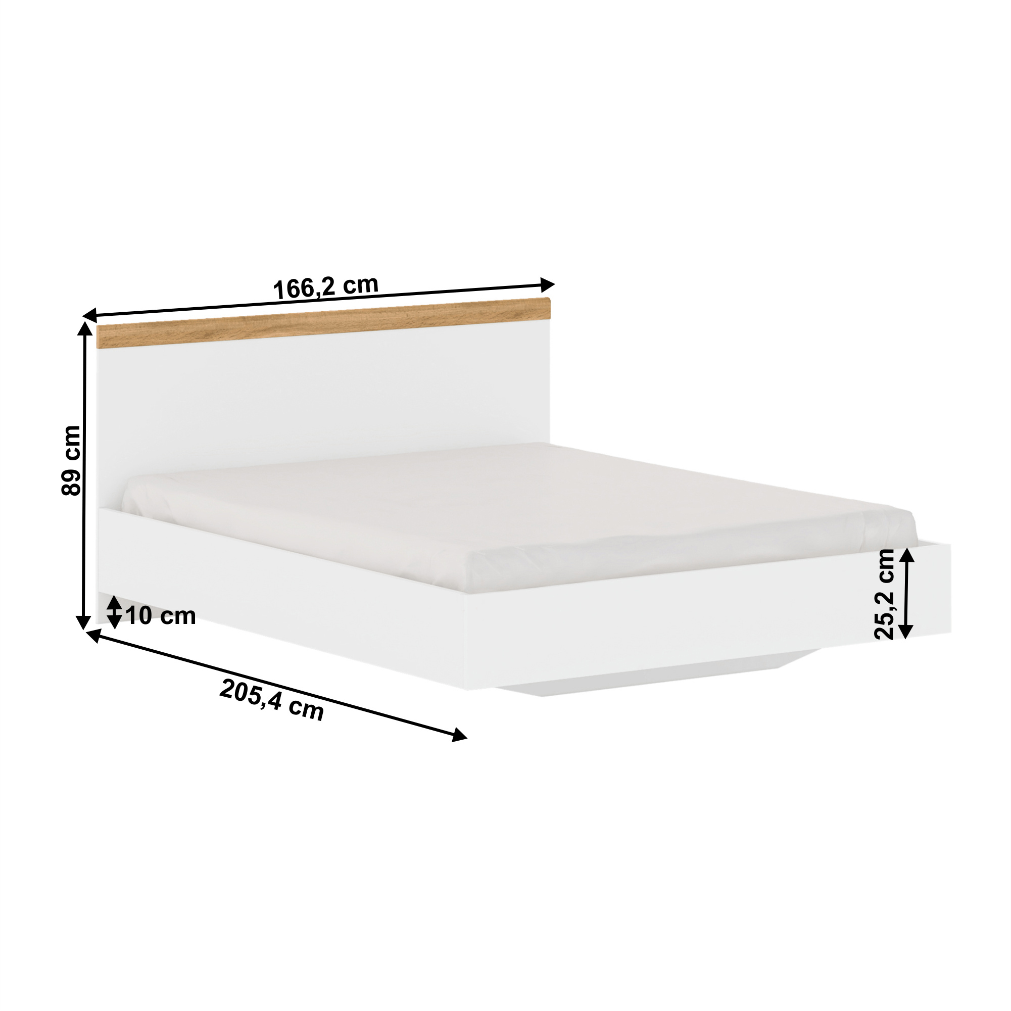 Materiál: DTD laminovaná/ABS hrany Barva: bílá/dub wotan Rozměry (ŠxHxV): 166,2x205,4x89 cm Plocha na spaní (ŠxD): 160x200 cm Nosnost na jedno lůžko: 120 kg Doporučená výška matrace: min 9cm Tloušťka materiálu: 1,6 - 2,2 cm Výška spodního prostoru od podlahy: 10 cm Výška bočnice: 25,2 cm Bez úložného prostoru Dodáváno bez matrace a roštu Možnost dokoupit rost a matraci z naší nabídky Dodáváno v demontu