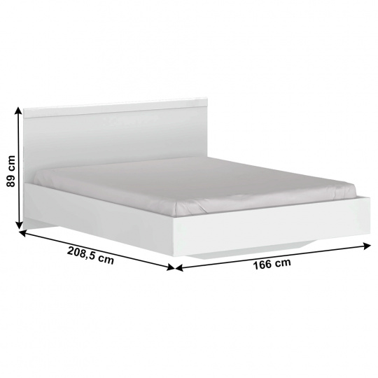 Materiál: laminovaná DTD Barva: bílá Rozměry (ŠxHxV): 166,2x205,4x89 cm Plocha na spaní: 160x200 cm Tloušťka materiálu: 1,6 cm ABS hrany Moderní design Elegantní postel Dodáváno bez roštu Doporučujeme zakoupit matraci s minimální výškou 16 cm a lamelový rošt Dodáváno bez matrace Dodáváno v demontu