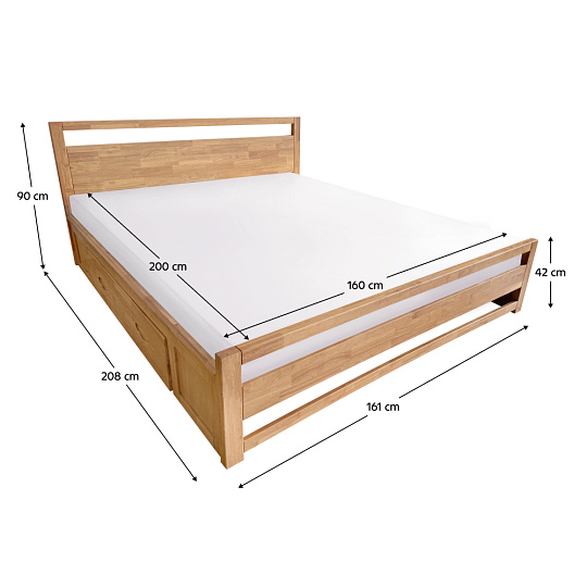 Materiál: kaučukové dřevo Barva: přírodní Rozměry (ŠxHxV): 161x208x90 cm Plocha na spaní (ŠxD): 160x200 cm Výška rámu postele: 42 cm Nosnost na jedno lůžko: 150 kg Úložný prostor Dva šuplíky 4 odkládací plochy Rozměry šuplíku (ŠxHxV): 115x60x17 cm Nosnost šuplíku: 10 kg Dodávána s roštem Rošt obsahuje borové latě Tloušťka latě: 1,4 cm Dodávána bez matrace Doporučujeme zakoupit matraci o rozměru 160x200 cm Doporučená výška matrace: min. 10 cm Dodávána bez polštářů, nočních stolků a dekorací Dodáváno v demontu