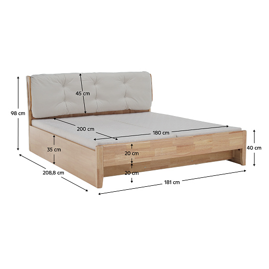 Materiál: látka/kaučukové dřevo/novozélandská borovice Oděruodolnost textilie podle testu Martindale: 10 000 oděrů Barva: přírodní Rozměry (ŠxHxV): 181x208,8x98 cm Plocha na spaní (ŠxD): 180x200 cm Nosnost na osobu: 150 kg Výška bočnice: 35 cm Výška po rošt: 33 cm Úložný prostor 5 odkládacích ploch Výška úložného prostoru: 24 cm Dodávána s laťkovým roštem Vyklápěcí rošt Tloušťka lamel: 1,4 cm Dodáváno bez matrace Prostor mezi roštem a čalouněním (opěrkou): 15 cm Doporučená výška matrace: 10-15 cm Možnost zakoupit matraci o rozměru 180x200 cm Moderní design Dodáváno v demontu