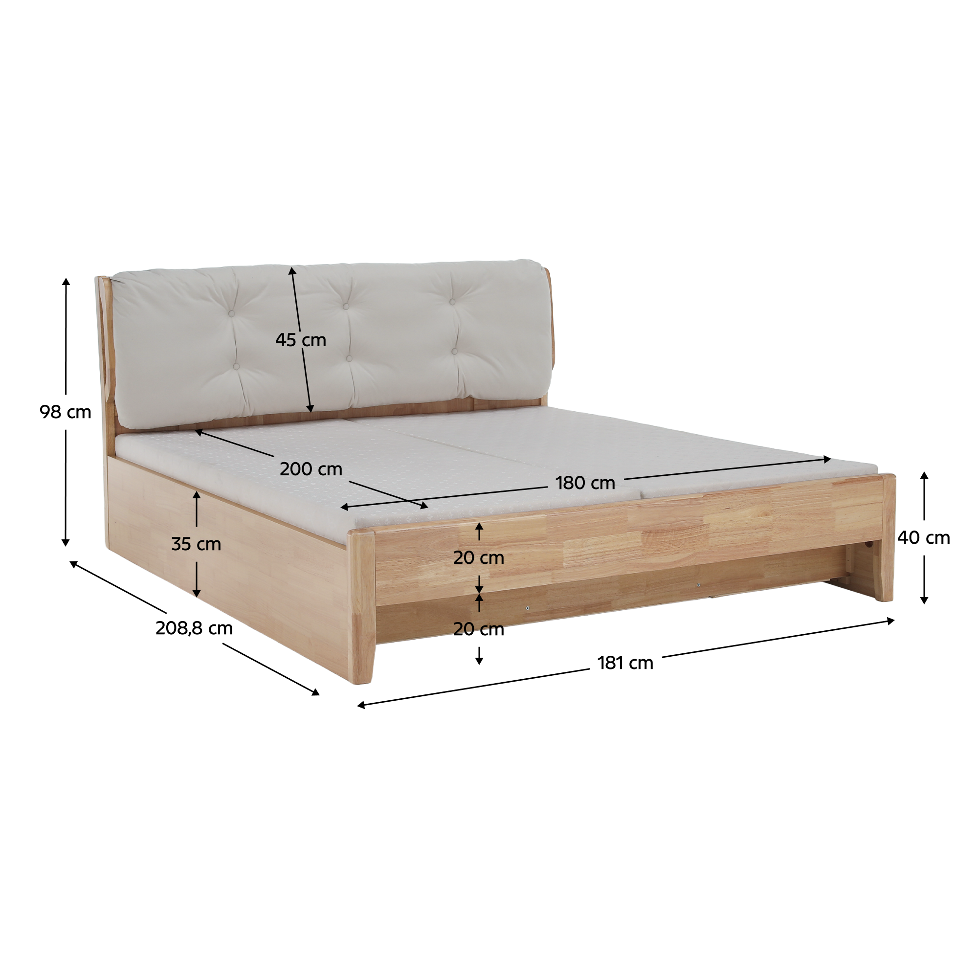 Materiál: látka/kaučukové dřevo/novozélandská borovice Oděruodolnost textilie podle testu Martindale: 10 000 oděrů Barva: přírodní Rozměry (ŠxHxV): 181x208,8x98 cm Plocha na spaní (ŠxD): 180x200 cm Nosnost na osobu: 150 kg Výška bočnice: 35 cm Výška po rošt: 33 cm Úložný prostor 5 odkládacích ploch Výška úložného prostoru: 24 cm Dodávána s laťkovým roštem Vyklápěcí rošt Tloušťka lamel: 1,4 cm Dodáváno bez matrace Prostor mezi roštem a čalouněním (opěrkou): 15 cm Doporučená výška matrace: 10-15 cm Možnost zakoupit matraci o rozměru 180x200 cm Moderní design Dodáváno v demontu