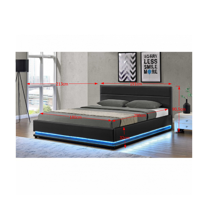 Materiál: ekokůže Oděruodolnost textilie podle testu Martindale: 100 000 oděrek Barva: černá Rozměry (ŠxHxV): 191x213x90,5 cm Plocha na spaní (ŠxD): 183x200 cm Výška po rošt: 32 cm Nosnost: 110 kg úložný prostor LED osvětlení s bílým světlem lamelový rošt Možnost dokoupit matraci Dodávané v demontu