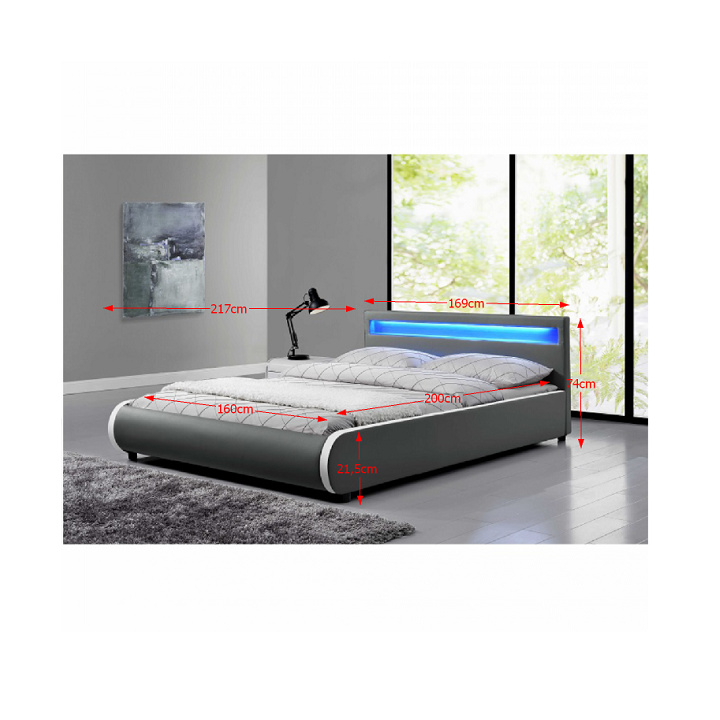 Luxusní moderní postel s lamelovým roštem a RGB LED osvětlením v čele postele Materiál: ekokůže Oděruodolnost textilie podle testu Martindale: 100 000 oděrek Barva: šedá Rozměry (ŠxHxV): 169x217x74 cm, plocha na spaní (ŠxD): 160x200 cm Výška po rošt: 21,5 cm Nosnost: 110 kg K posteli doporučujeme zakoupit matraci v rozměru 160x200 cm na základě naší nabídky. Doporučená výška matrace: 20-30 cm Dodávané v demontu.