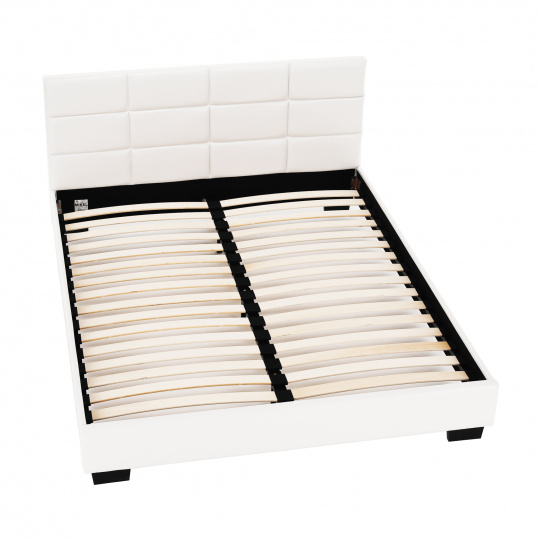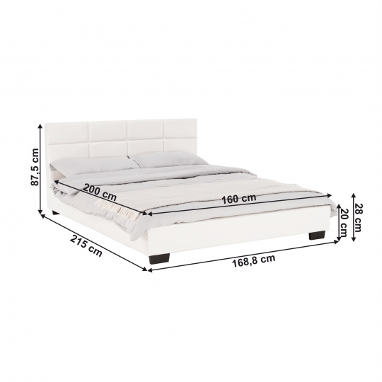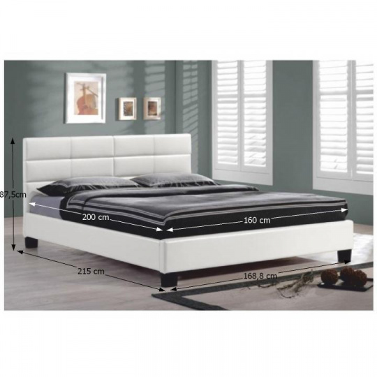 Postel MIKEL s prošívaným čelem, s lamelovým roštem. Barevné provedení bílá ekokůže. Oděruodolnost textilie podle testu Martindale: 100 000 oděrek Rozměry (ŠxHxV): 168,8x215x87,5 cm Rozměry plochy na spaní (ŠxD): 160x200 cm K posteli doporučujeme zakoupit matraci s rozměrem 160x200 cm. Výška po rošt: 20 cm Výška postele: 28 cm Nosnost na lůžko: 100 kg Dodávané bez matrace.