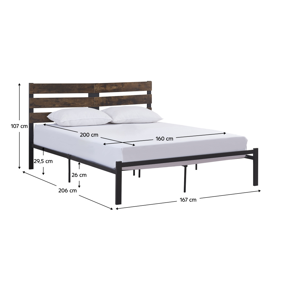 Materiál: kov/DTD Barva: černá/dub rustikál Rozměry (ŠxHxV): 167x206x101 cm Plocha na spaní (ŠxD): 160x200 cm Výška po rošt: 29,5 cm Nosnost: 300 kg Na nožičkách Výška nožiček: 26 cm Dodávána s kovovým roštem Dodáváno bez matrace Doporučujeme zakoupit matraci z naší nabídky Doporučená výška matrace: 20 cm Rustikální styl Dodáváno v demontu