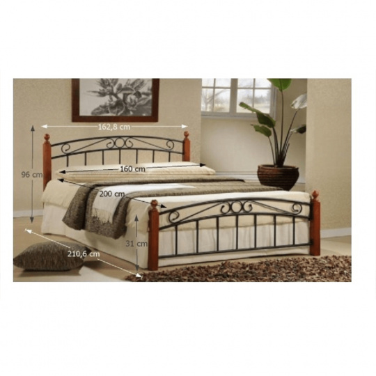 Kovová postel s lamelovým roštem, DOLORES Materiál: kov / dřevo Barva: černá / třešeň Vnější rozměry postele (ŠxHxV): 162,8x210,6x96 cm Plocha na spaní: 160x200 cm Výška po rošt: 31 cm Nosnost: 100 kg Dodávaná s lamelovým roštem Dodávána bez matrace Dodávané v demontu Možnost dokoupení matrace o rozměru 160x200 cm nebo 2x 80x200 cm z naší nabídky. Dodávané v demontu.