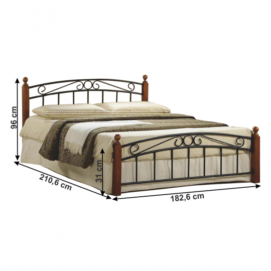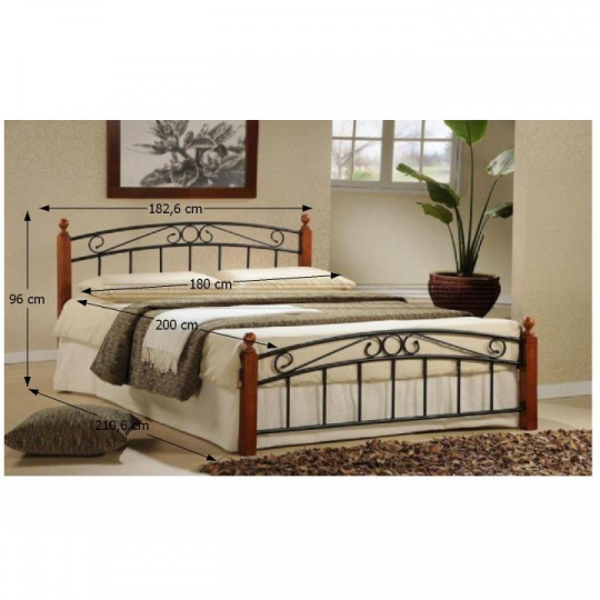 Kovová postel s lamelovým roštem, DOLORES Materiál: kov / dřevo Barva: černá / třešeň Vnější rozměry postele (ŠxHxV): 182,8x210,6x96 cm Plocha na spaní: 180x200 cm Výška po rošt: 31 cm Nosnost: 100 kg Dodávaná s lamelovým roštem Dodávána bez matrace Dodávané v demontu Možnost dokoupení matrace s rozměrem 180x200 cm nebo 2x 90x200 cm z naší nabídky. Dodávané v demontu.