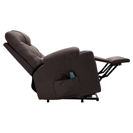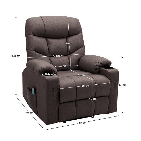 Materiál: ocel/látka Oděruodolnost textilie podle testu Martindale: 50 000 oděrů Výplň: pěna s vysokou hustotou 240D Barva: hnědá Rozměry (ŠxHxV): 87x97-155x80-108 cm Výška sedu: 49 cm Hloubka sedu: 56 cm Šířka sedu: 56 cm Šířka zad: 79 cm Výška zádové opěrky: 70 cm Nosnost: 150 kg Polohovací Relaxační Masážní 6 masážních vibračních bodů 8 masážních metod Časovač 15-30 min 3 nastavitelné úrovně intenzity Odkládací prostor Praktické boční kapsy Elektrická funkce zvedání Mechanismus vyklápění podnože a zad Zvedací křeslo Dodáváno s dálkovým ovládáním pro polohování Délka síťového kabelu: 1,5 m Délka kabelu od dálkového ovladače: 1,5 m Dodáváno s dálkovým ovládáním pro masáž Délka síťového kabelu: 1,8 m Délka kabelu od dálkového ovladače: 1,1 m Napětí: 100-240V Dodáváno v demontu