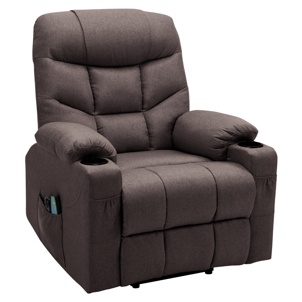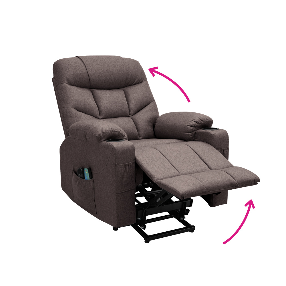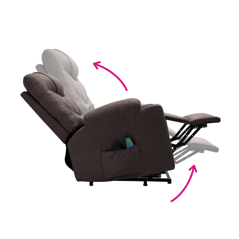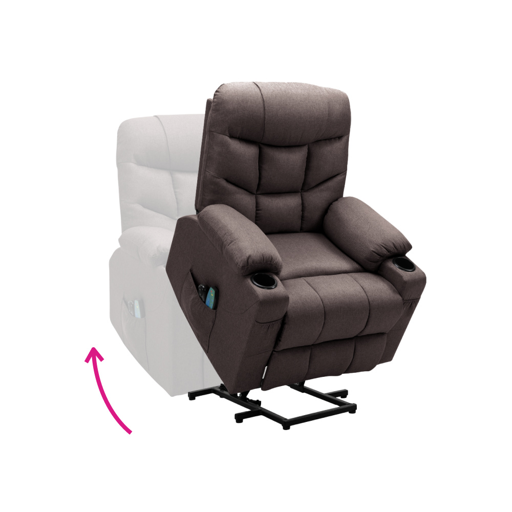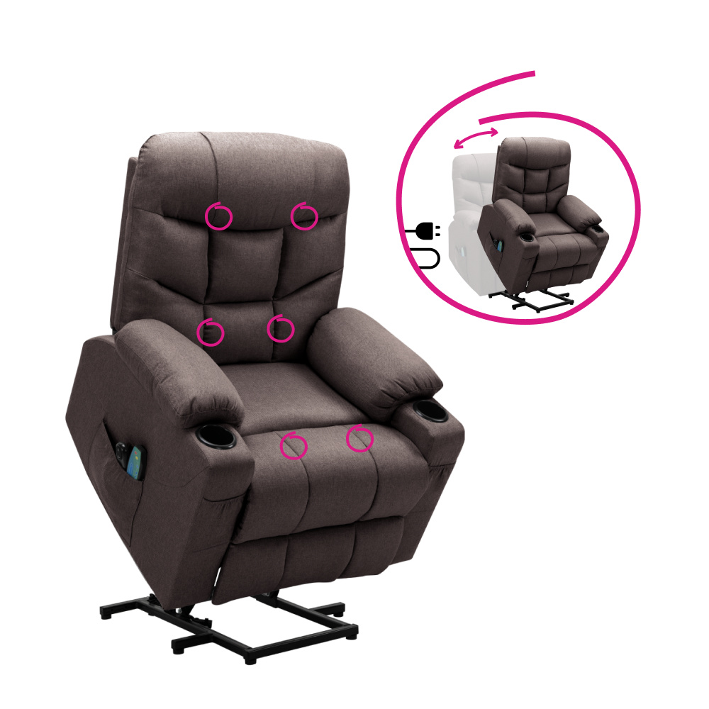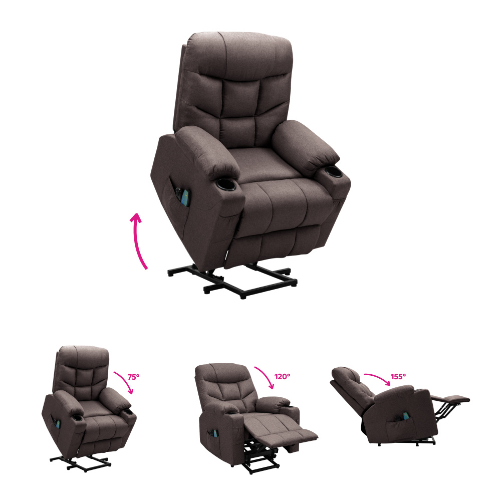 Materiál: ocel/látka Oděruodolnost textilie podle testu Martindale: 50 000 oděrů Výplň: pěna s vysokou hustotou 240D Barva: hnědá Rozměry (ŠxHxV): 87x97-155x80-108 cm Výška sedu: 49 cm Hloubka sedu: 56 cm Šířka sedu: 56 cm Šířka zad: 79 cm Výška zádové opěrky: 70 cm Nosnost: 150 kg Polohovací Relaxační Masážní 6 masážních vibračních bodů 8 masážních metod Časovač 15-30 min 3 nastavitelné úrovně intenzity Odkládací prostor Praktické boční kapsy Elektrická funkce zvedání Mechanismus vyklápění podnože a zad Zvedací křeslo Dodáváno s dálkovým ovládáním pro polohování Délka síťového kabelu: 1,5 m Délka kabelu od dálkového ovladače: 1,5 m Dodáváno s dálkovým ovládáním pro masáž Délka síťového kabelu: 1,8 m Délka kabelu od dálkového ovladače: 1,1 m Napětí: 100-240V Dodáváno v demontu