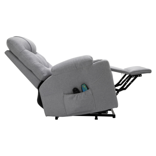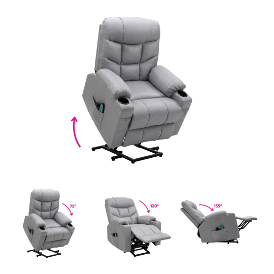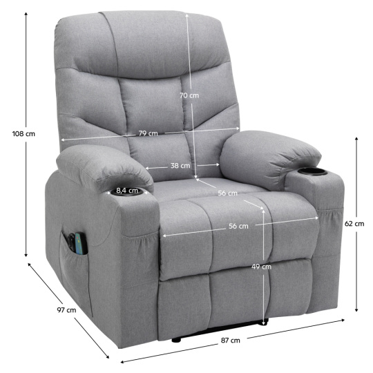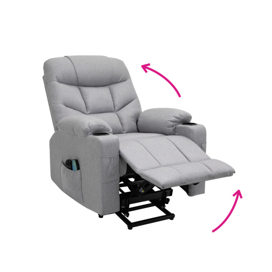 Materiál: ocel/látka Oděruodolnost textilie podle testu Martindale: 50 000 oděrů Výplň: pěna s vysokou hustotou 240D Barva: světle šedá Rozměry (ŠxHxV): 87x97-155x80-108 cm Výška sedu: 49 cm Hloubka sedu: 56 cm Šířka sedu: 56 cm Šířka zad: 79 cm Výška zádové opěrky: 70 cm Nosnost: 150 kg Polohovací Relaxační Masážní 6 masážních vibračních bodů 8 masážních metod Časovač 15-30 min 3 nastavitelné úrovně intenzity Odkládací prostor Praktické boční kapsy Elektrická funkce zvedání Mechanismus vyklápění podnože a zad Zvedací křeslo Dodáváno s dálkovým ovládáním pro polohování Délka síťového kabelu: 1,5 m Délka kabelu od dálkového ovladače: 1,5 m Dodáváno s dálkovým ovládáním pro masáž Délka síťového kabelu: 1,8 m Délka kabelu od dálkového ovladače: 1,1 m Napětí: 100-240V Dodáváno v demontu