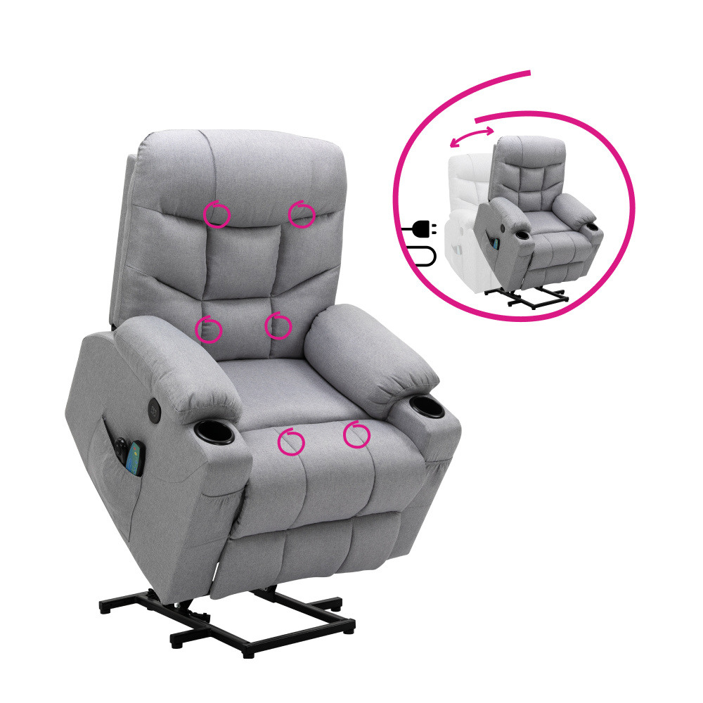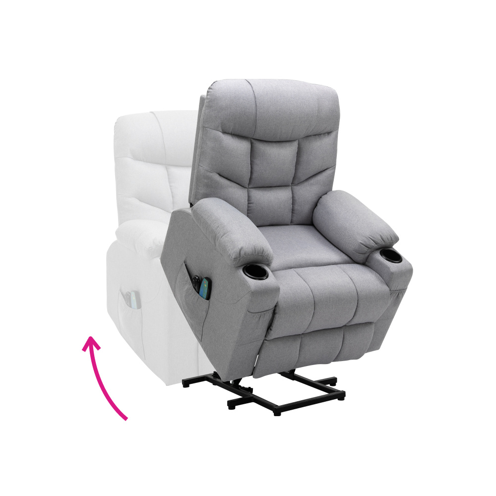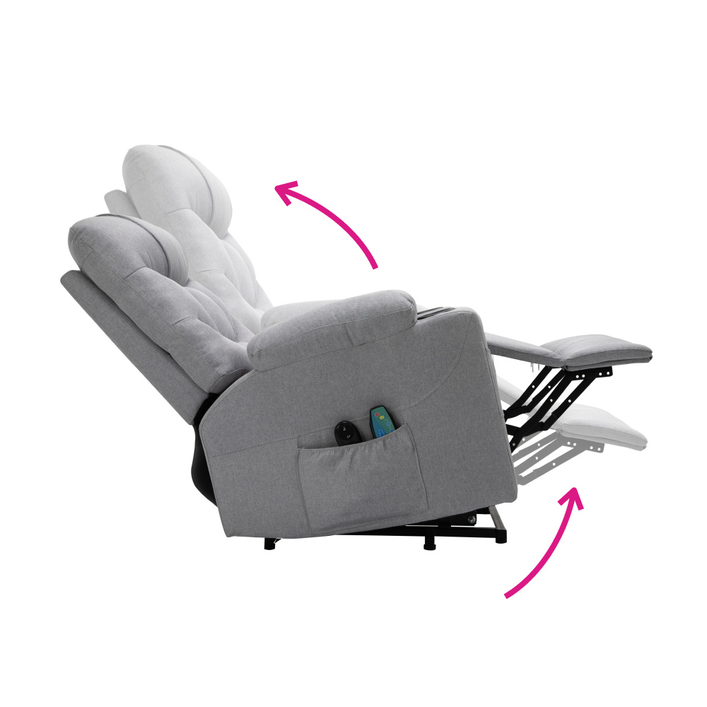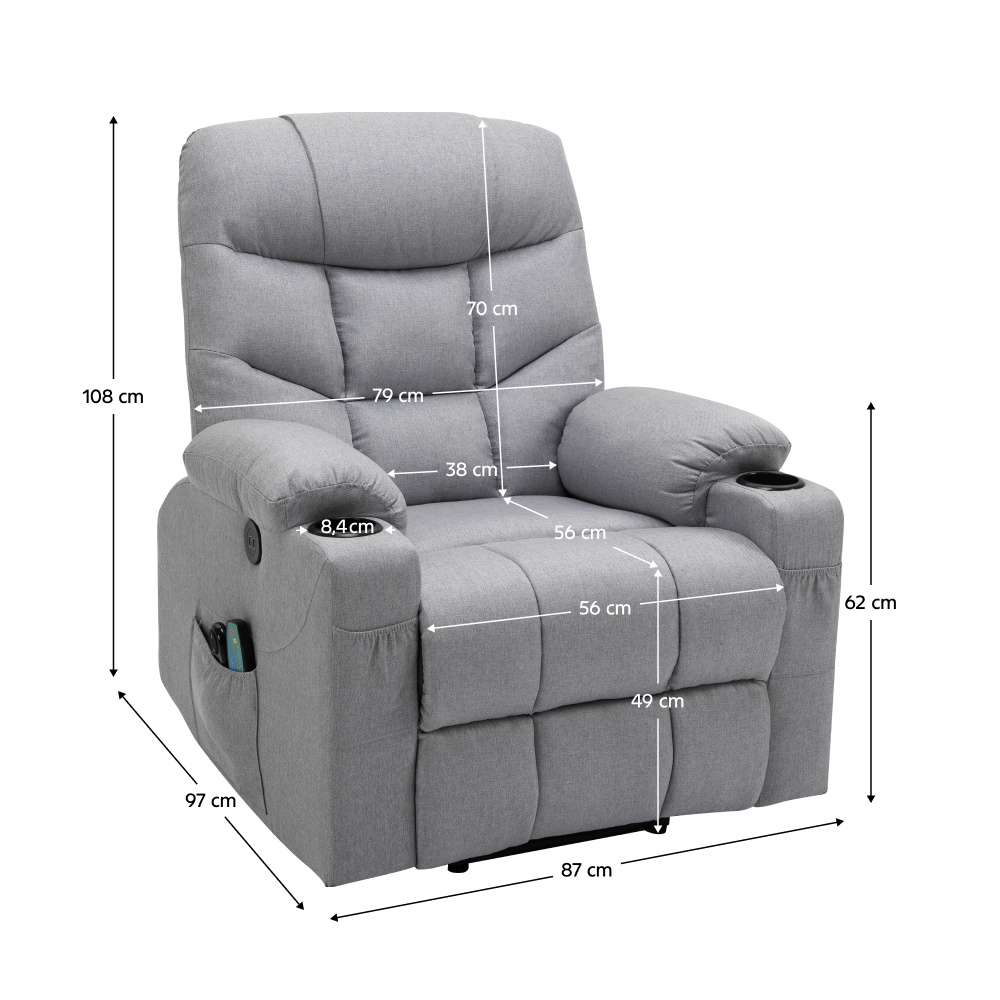 Materiál: ocel/látka Oděruodolnost textilie podle testu Martindale: 50 000 oděrů Výplň: pěna s vysokou hustotou 240D Barva: světle šedá Rozměry (ŠxHxV): 87x97-155x80-108 cm Výška sedu: 49 cm Hloubka sedu: 56 cm Šířka sedu: 56 cm Šířka zad: 79 cm Výška zádové opěrky: 70 cm Nosnost: 150 kg Polohovací Relaxační Masážní 6 masážních vibračních bodů 8 masážních metod Časovač 15-30 min 3 nastavitelné úrovně intenzity Odkládací prostor Praktické boční kapsy Elektrická funkce zvedání Mechanismus vyklápění podnože a zad Zvedací křeslo Dodáváno s dálkovým ovládáním pro polohování Délka síťového kabelu: 1,5 m Délka kabelu od dálkového ovladače: 1,5 m Dodáváno s dálkovým ovládáním pro masáž Délka síťového kabelu: 1,8 m Délka kabelu od dálkového ovladače: 1,1 m Napětí: 100-240V Dodáváno v demontu