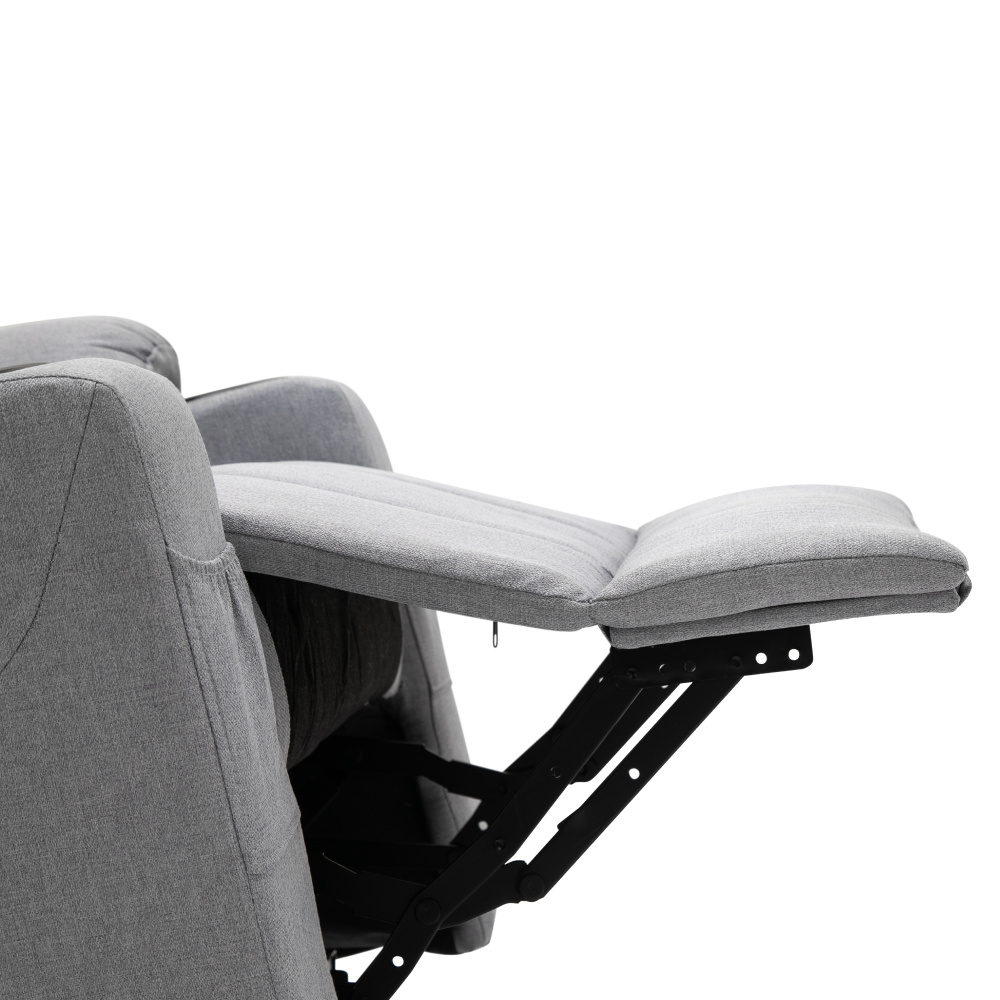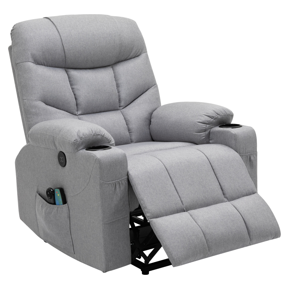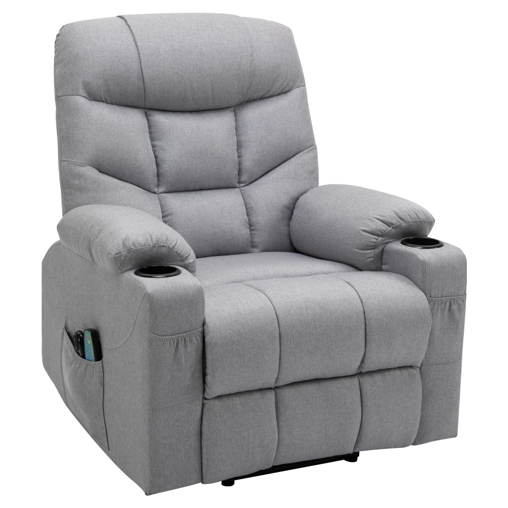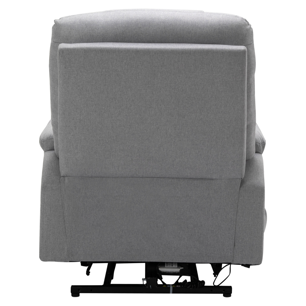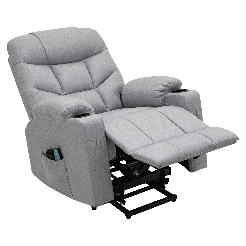 Materiál: ocel/látka Oděruodolnost textilie podle testu Martindale: 50 000 oděrů Výplň: pěna s vysokou hustotou 240D Barva: světle šedá Rozměry (ŠxHxV): 87x97-155x80-108 cm Výška sedu: 49 cm Hloubka sedu: 56 cm Šířka sedu: 56 cm Šířka zad: 79 cm Výška zádové opěrky: 70 cm Nosnost: 150 kg Polohovací Relaxační Masážní 6 masážních vibračních bodů 8 masážních metod Časovač 15-30 min 3 nastavitelné úrovně intenzity Odkládací prostor Praktické boční kapsy Elektrická funkce zvedání Mechanismus vyklápění podnože a zad Zvedací křeslo Dodáváno s dálkovým ovládáním pro polohování Délka síťového kabelu: 1,5 m Délka kabelu od dálkového ovladače: 1,5 m Dodáváno s dálkovým ovládáním pro masáž Délka síťového kabelu: 1,8 m Délka kabelu od dálkového ovladače: 1,1 m Napětí: 100-240V Dodáváno v demontu