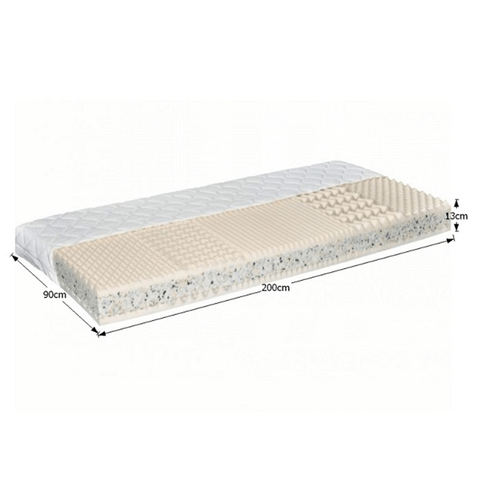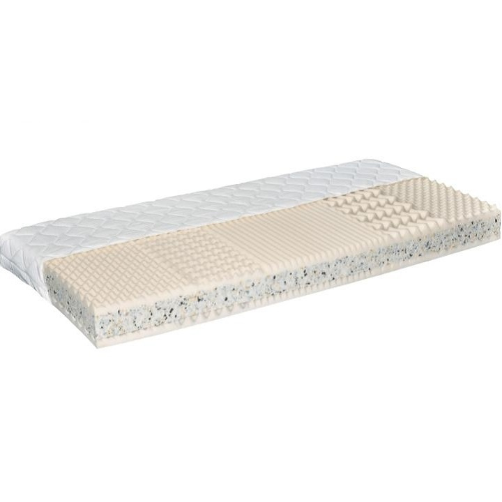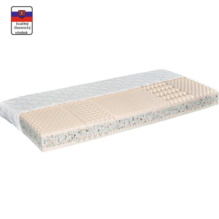 Sendvičová matrace v kombinaci PUR pěna a RE pěny 5 atomových zón, maximální prodyšnost pěny a odvod vlhkosti, použití oboustranné,možné použití na pevnou podložku o polohovatelný rošt, nosnost matrace je 120 kg, výška matrace 16 cm, rozměr matrace: 90x200 cm, Nosnost: cca 110 kg potah Silver / 100% polyester /, snadno snímatelný, zip po celém obvodu matrace, pratelný na 60 stupňů. Možnost objednat iv potahu Aloe Vera Proactive. Tvrdost matrace: tvrdý T4 Ideální rozestup mezi latěmi/lamelami je 2-3 cm