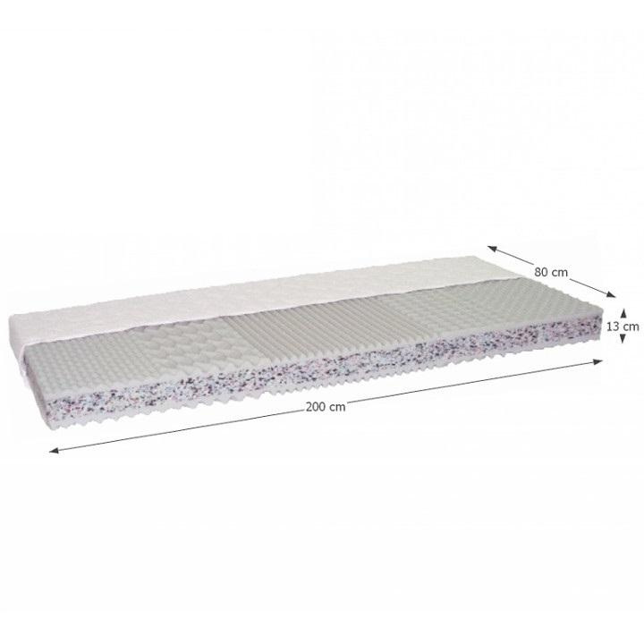 Materiál: PUR pěna/RE pěna Rozměry (ŠxD): 80x200 cm Výška matrace: 13 cm Nosnost: cca 110 kg Tvrdost matrace: tvrdá T4 Matrace v této kategorii (stupeň tvrdosti T4) jsou opravdu tuhé. Jsou dostatečně odpružené, aby se předešlo problémům v oblasti s největším tlakovým zatížením. Vhodné pro spaní na zádech a břiše. Pro lidi s hmotností více než 100 kilogramů. Oboustranný Masážní nopky na povrchu Možnost použít na pevném i polohovacím roštu Potah Silver se zipem po celém obvodu Ideální rozestup mezi latěmi/lamelami je 2-3 cm