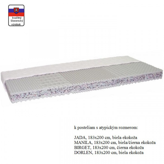 Sendvičová matrace Catania Eco ATYP, 183x200, kombinace PUR pěny a RE pěny, potah SILVER / 100% polyester /, lehce snímatelný, zip po celém obvodu, prát při 60 ° C. Matrace je v atypickém rozměru 183x200 cm. Nosnosť: cca 110 kg. Ideální rozestup mezi latěmi/lamelami je 2-3 cm Tvrdost matrace: tvrdý T4. Je speciálně vyroben k postelím s takovým vnitřním rozměrem. Matrace doporučujeme k postelím: postel JADA, 180x200 cm, ekokůže bílá postel MANILA, 180x200 cm, ekokůže bílá / černá postel BIRGET, 180x200 cm, ekokůže černá postel DORLEN, 180x200 cm, ekokůže bílá