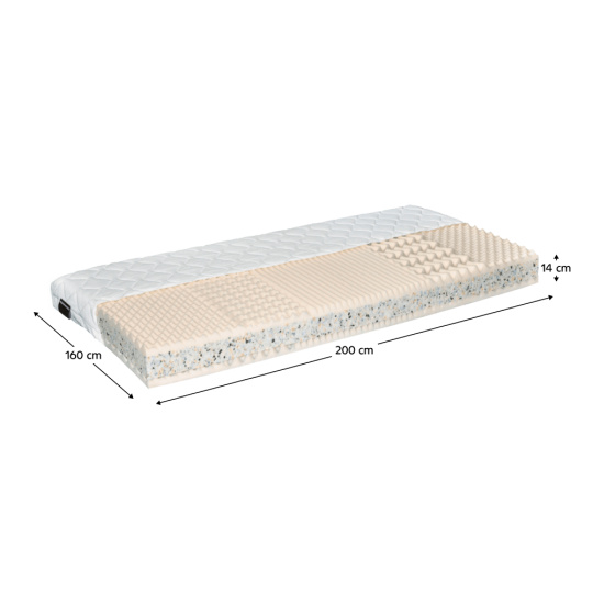 Matrace MONIKA 160x200 cm je tvořen kombinací dvou PUR pěn a RE pěny, Profilace na obou PUR pěnách zajistí dokonalé prokrvení pokožky, Zónování a vyznačuje se vysokou odolností vůči proležení díky použití velké vrstvy RE pěny, Dodávaný v kvalitním potahu Aloe, který je možno sundat a vyprat při teplotě 60 ° C. Výška je cca 14 cm, Nosnost matrace je do 110 kg. Tvrdost matrace: tvrdý T4 Potah s certifikátem OEKO-TEX STANDARD Ideální rozestup mezi latěmi/lamelami je 2-3 cm