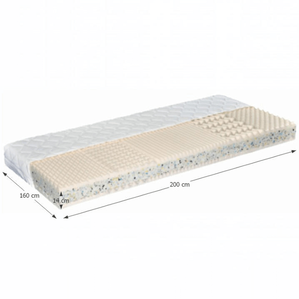 Matrace MONIKA 160x200 cm je tvořen kombinací dvou PUR pěn a RE pěny, Profilace na obou PUR pěnách zajistí dokonalé prokrvení pokožky, Zónování a vyznačuje se vysokou odolností vůči proležení díky použití velké vrstvy RE pěny, Dodávaný v kvalitním potahu Aloe, který je možno sundat a vyprat při teplotě 60 ° C. Výška je cca 14 cm, Nosnost matrace je do 110 kg. Tvrdost matrace: tvrdý T4 Potah s certifikátem OEKO-TEX STANDARD Ideální rozestup mezi latěmi/lamelami je 2-3 cm